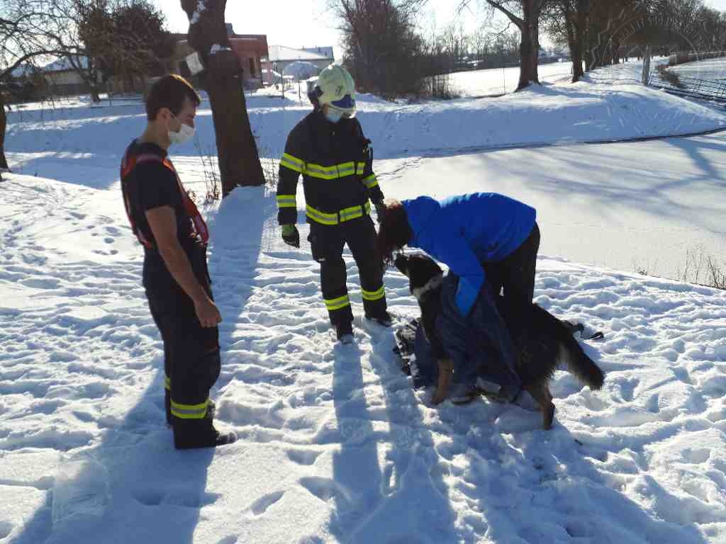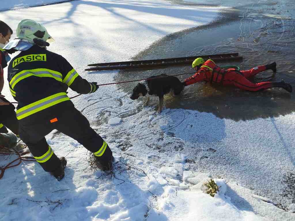 V Srnojedech dnes hasiči zachraňovali psa, pod kterým se probořil led. Na místo byla vyslána profesionální jednotka hasičů z Pardubic. Jeden z hasičů se již při jízdě k zásahu vystrojil do speciálního suchého obleku „ursuit“ se záchrannou vestou. Ihned po příjezdu na místo hasič v obleku jištěn lanem skočil do ledové vody řeky Labe. Zvíře hasič chytil a vytáhl ho na silnější led a následně na břeh. Po vytažení byl zvířeti, které vážilo zhruba 60 kg, poskytnut tepelný komfort v podobě deky, do kterého psa majitelka následně otřela.