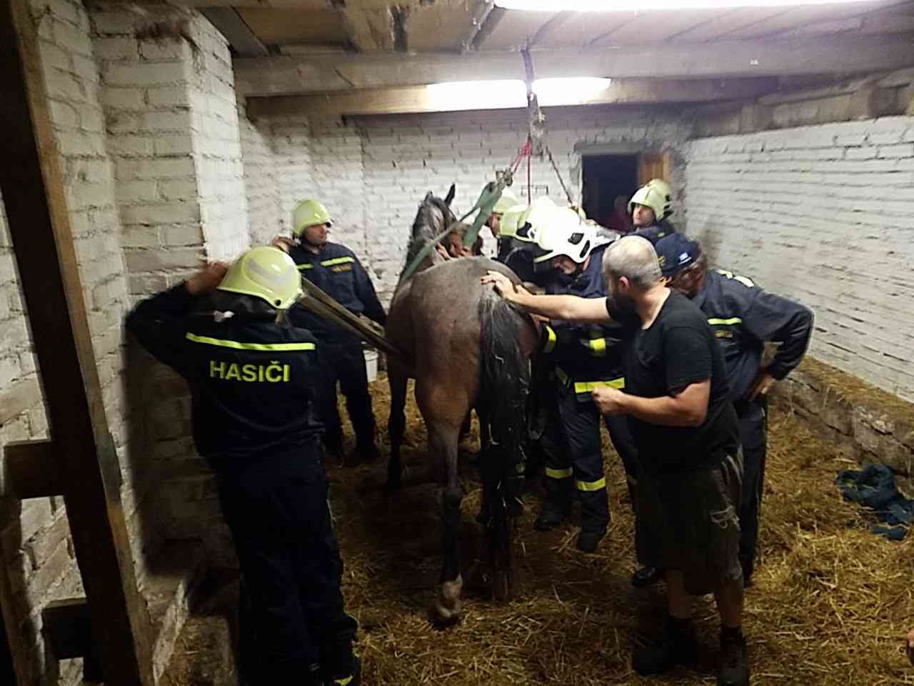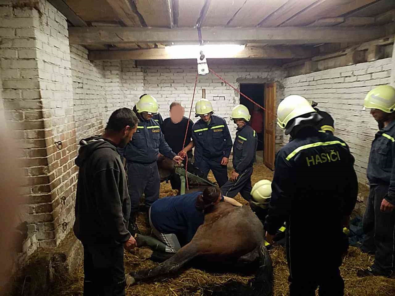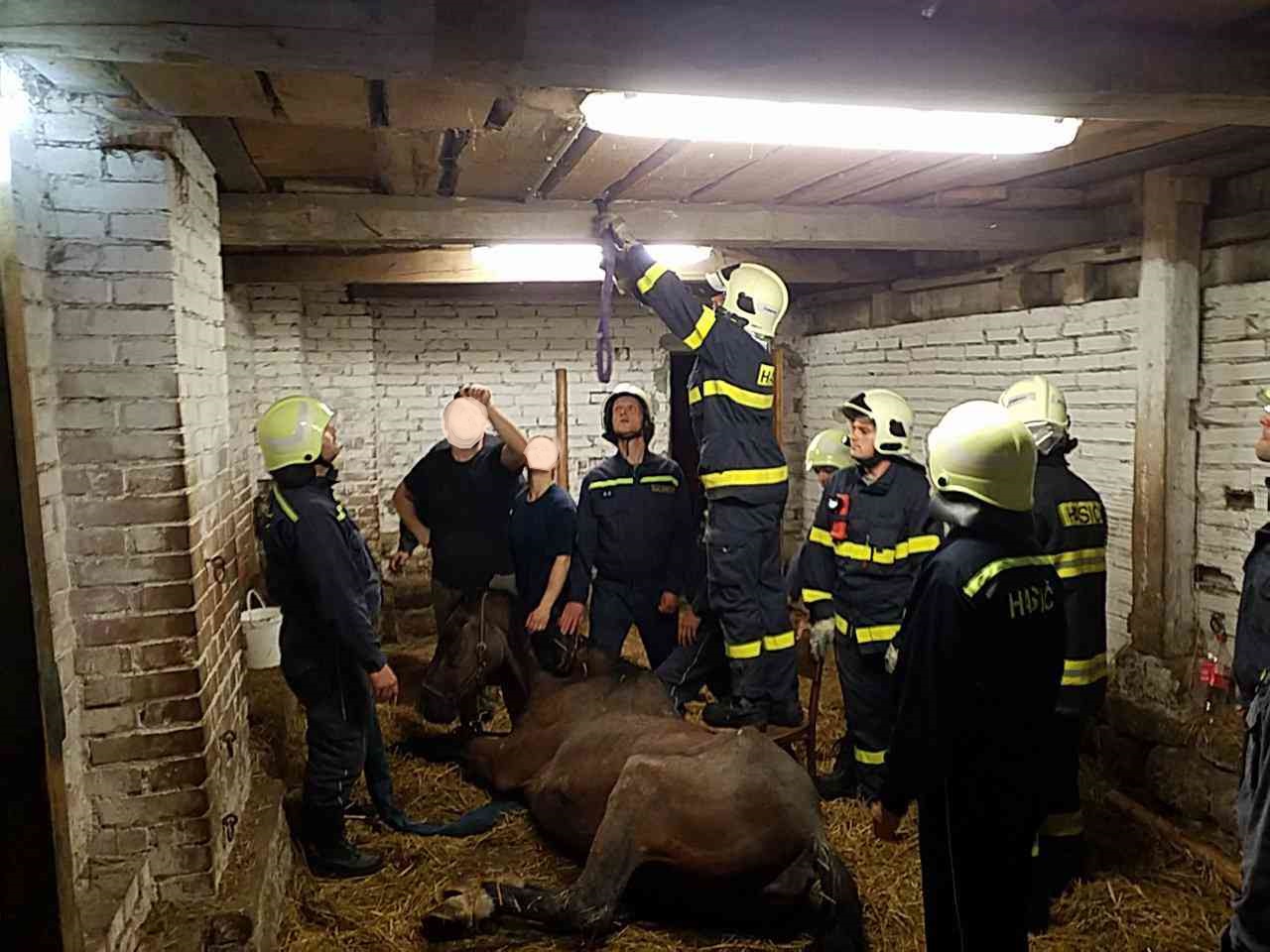 Kůň se ve stáji ve dveřích, kde upadl, již na nohy nepostavil. Koně hasiči uvázali do popruhů a pomocí kladky ho postavili zpět na...