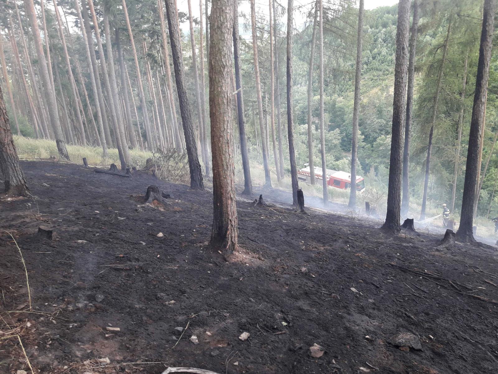 Jednalo se asi o 40 vzrostlých smrků. Zásah byl náročný, hořelo ve velmi těžko přístupném terénu a v příkrém kopci. Dle slov vyšetřovatelky hasičů, která se zabývá příčinou vzniku požáru, zde hořelo již v pondělí. Zřízena byla kyvadlová doprava vody. Nejednalo se o plamenné hoření, hasiči museli ohniska požáru prolévat vodou a kontrolovali je termokamerou.