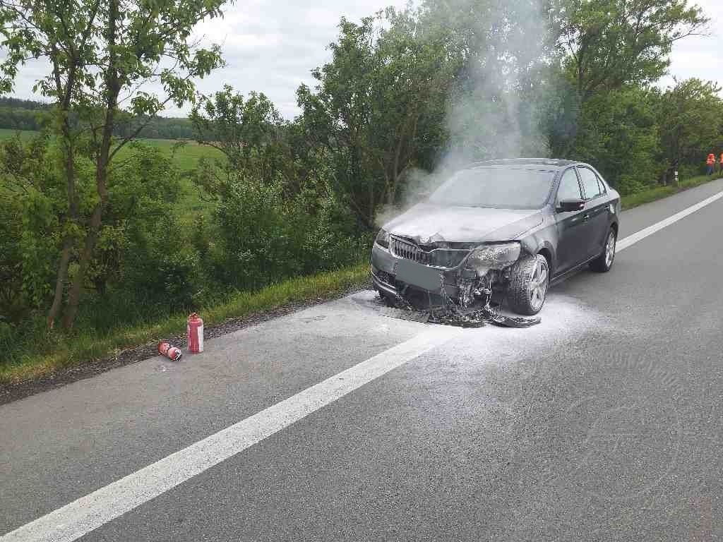 Hořící automobil na silnici I/35