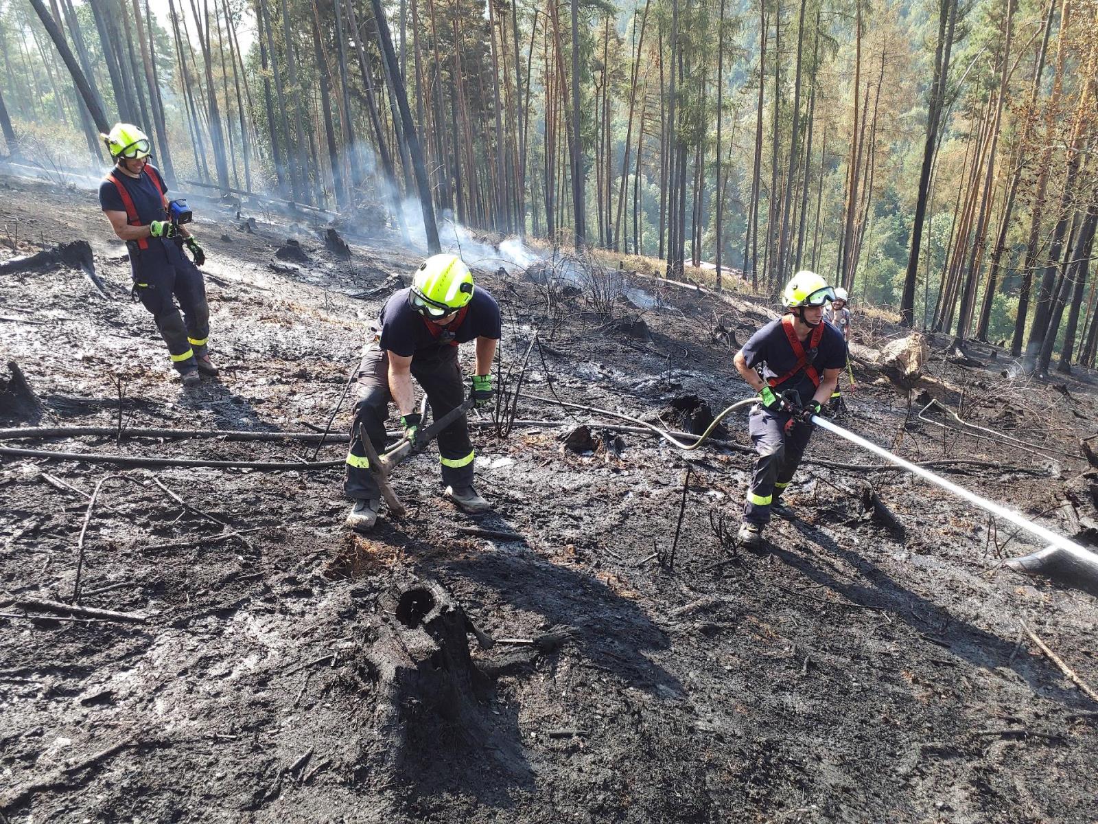 I během soboty zasahují jednotky hasičů ve vysokých teplotách a musí prolévat ohniska požáru ve velmi členitém terénu.
