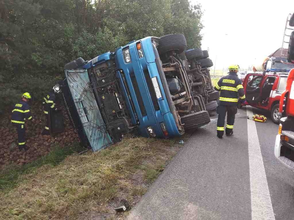 Kamion s návěsem se převrátil v Dražkovicích