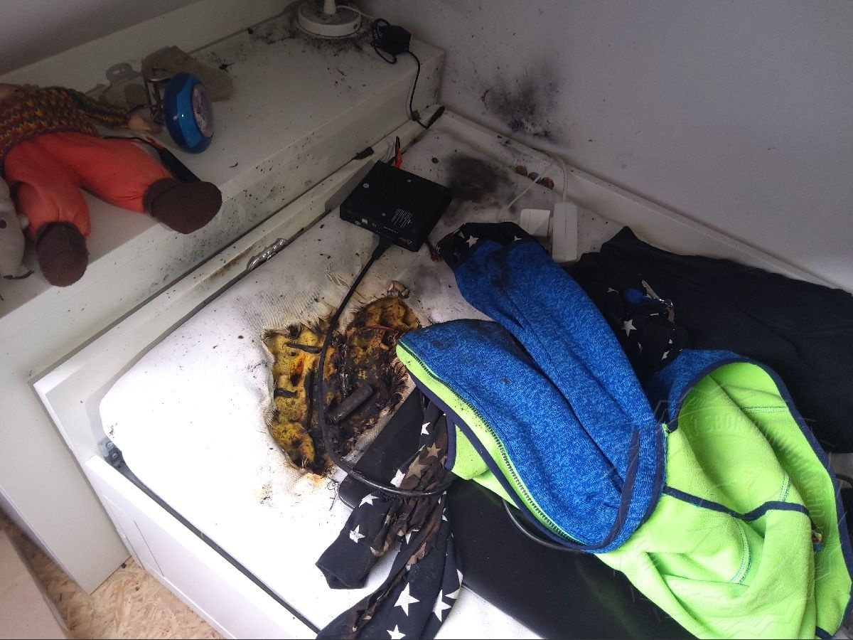 Při nabíjení baterie došlo zřejmě ke zkratu a následnému požáru. V domě byl pouze mladý chlapec, který se zachoval velmi statečně. Plameny uhasil pomocí oblečení, poté zavolal rodičům, a i na telefonní linku 150. Pardubičtí hasiči po příjezdu už jen vypnuli elektrický proud, odstranili matraci a poskytli chlapci posttraumatickou pomoc.  Na místo se dostavil otec dítěte, vyšetřovatel hasičů a Policie ČR.