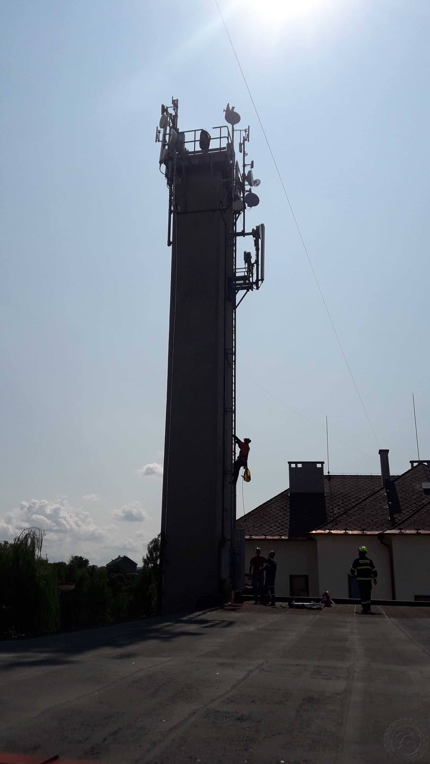 Ne, nešlo o scénku z filmu Postřižiny, ale o servisního mechanika z firmy, jenž poskytuje internet, který vylezl na komín do výšky asi 30 m, aby zkontroloval anténu. Ale z neznámých důvodů už nemohl slézt dolů.