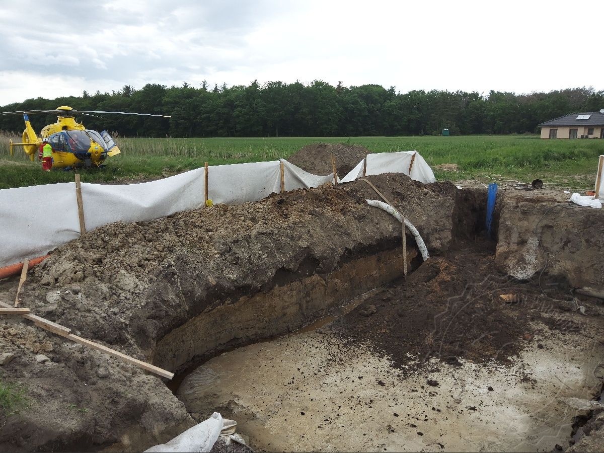 Při výkopových pracích na bazén došlo k sesuvu hlíny. Uvnitř zůstal zasypaný muž. Naštěstí byl na blízku soused, který odhrnul část půdy, aby osoba mohla dýchat. Jednotka nešťastníka, který byl po celou dobu při vědomí, vysvobodila pomocí ručního nářadí. Celá akce proběhla rychle. Na místo byl povolán i vrtulník, který nakonec odletěl prázdný. Zdravotnická záchranná služba si zraněného převezla do nemocnice sanitkou.