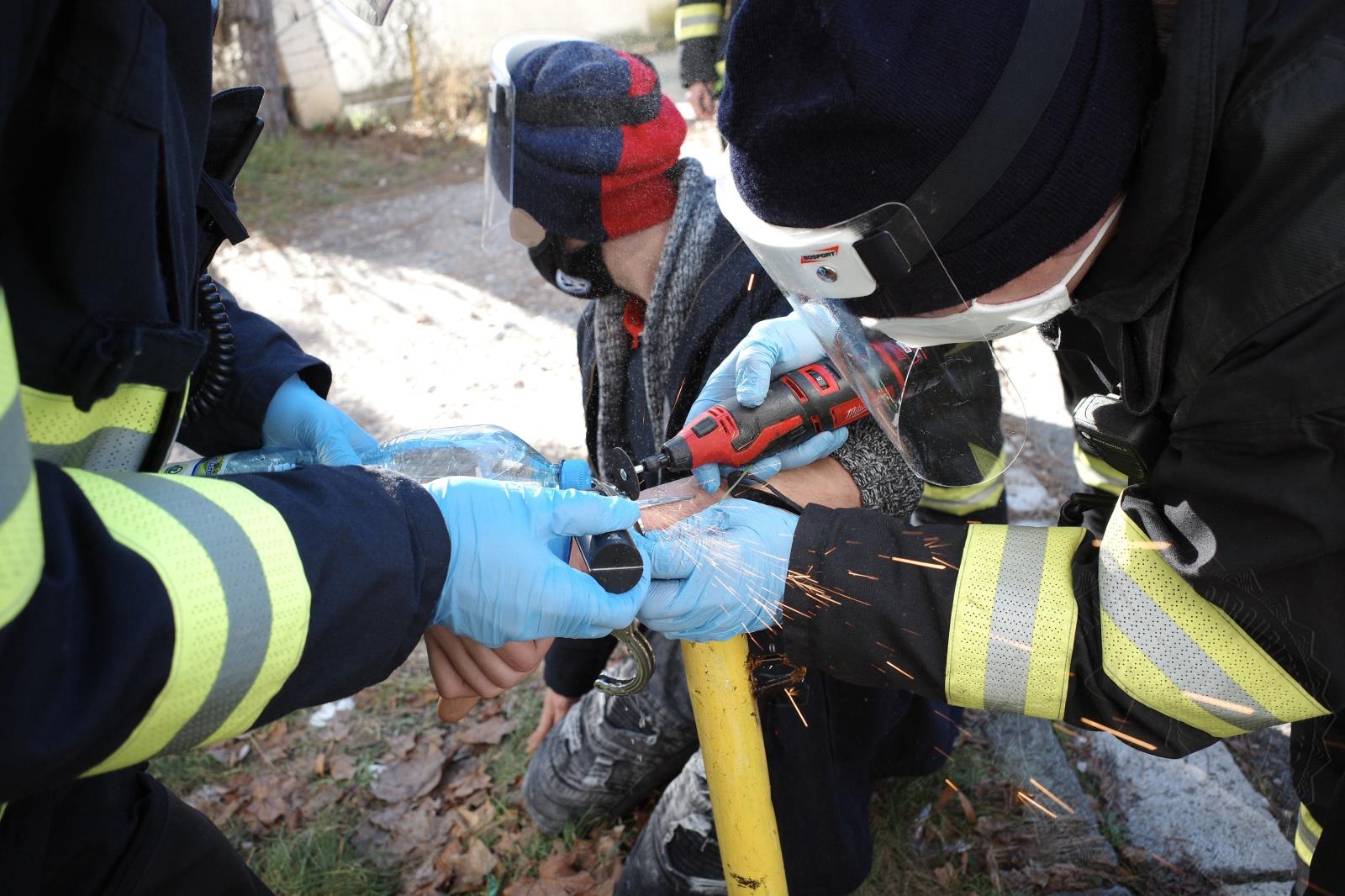 Muž byl zřejmě hračička. Ubytován měl být v hotelu v centru Pardubic. Tady si večer měl pohrávat s pouty ještě pravděpodobně s dalším mužem. Ovšem spoutaný v nich zůstal až do rána. Na místo před hotel hasiče přivolala hlídka Městské policie Pardubice. Přivolaní hasiči se hned pustili do „operace“. Obě oka pout měl nešťastník zamknuta na jedné ruce. Hasiči pomocí stopkové brusky, určené na drobné a přesné broušení, které používají v poslední době velmi často hasiči při odstranění prstýnků, se podařilo pevně dotažená pouta bleskurychle překonat.