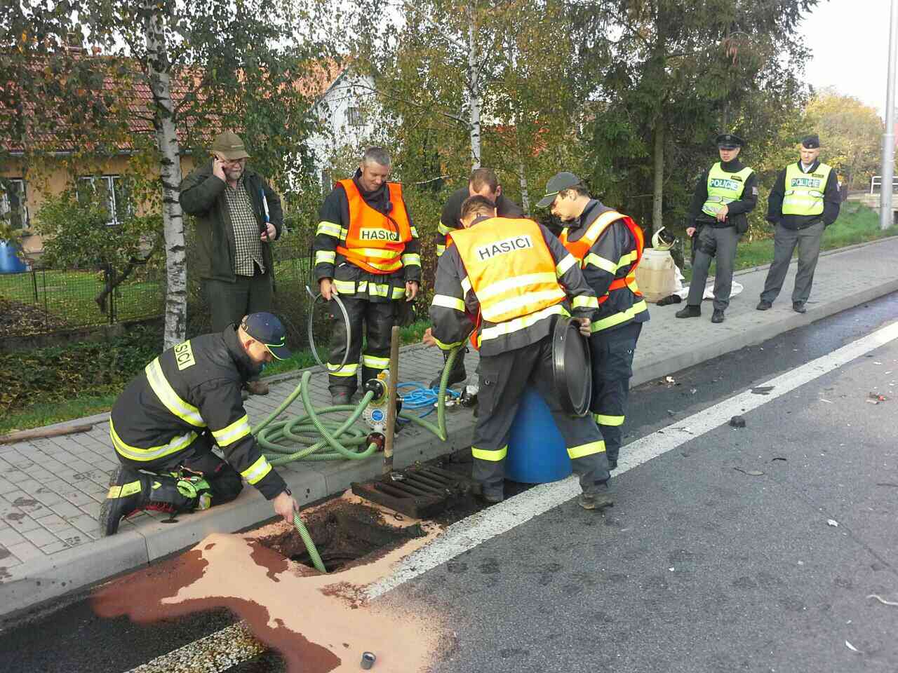 Na silnici I/35 do Ostřetína vyjížděli ve středu 18. října v 8.47 hodin profesionální hasiči z Holic a Pardubic a dále byli povoláni dobrovolní hasiči z Ostřetína. Došlo zde ke střetu osobního vozidla s kamionem. Silnice musela být v obou směrech uzavřena a zřízena byla objízdná trasa. Při nehodě nebyl nikdo zraněn. Z nádrže kamionu uniklo do kanalizace zhruba 700 litrů nafty. Hasiči zjistili, že kanalizace je spojena s potokem. Ihned tedy bylo nutné ohradit včas potok pomocí sorpčních hadů. Uniklou naftu na komunikaci hasiči zasypali sorbentem, tedy prostředkem k likvidaci uniklých kapalin jako jsou ropné produkty. Potok byl včas zajištěn a ohrazen. Hasiči odčerpali kanálovou vpusť a odčerpali i zbylou naftu z nádrže kamionu. Na místo byl povolán i pracovník životního prostředí.