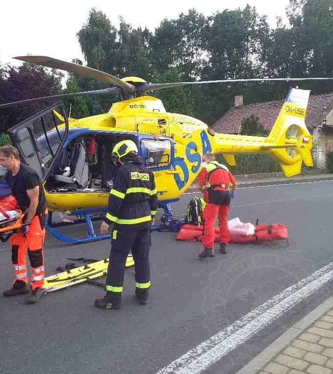 Dopravní nehoda osobního vozidla a motocyklu se stala v pondělí 19. července odpoledne na kruhovém objezdu. Na místo byla povolána i letecká záchranná služba. Velitel zásahu navigoval vrtulník na místo přistání a hasiči řídili kyvadlový provoz na komunikaci. Také asistovali zdravotníkům s transportem zraněného do vrtulníku.