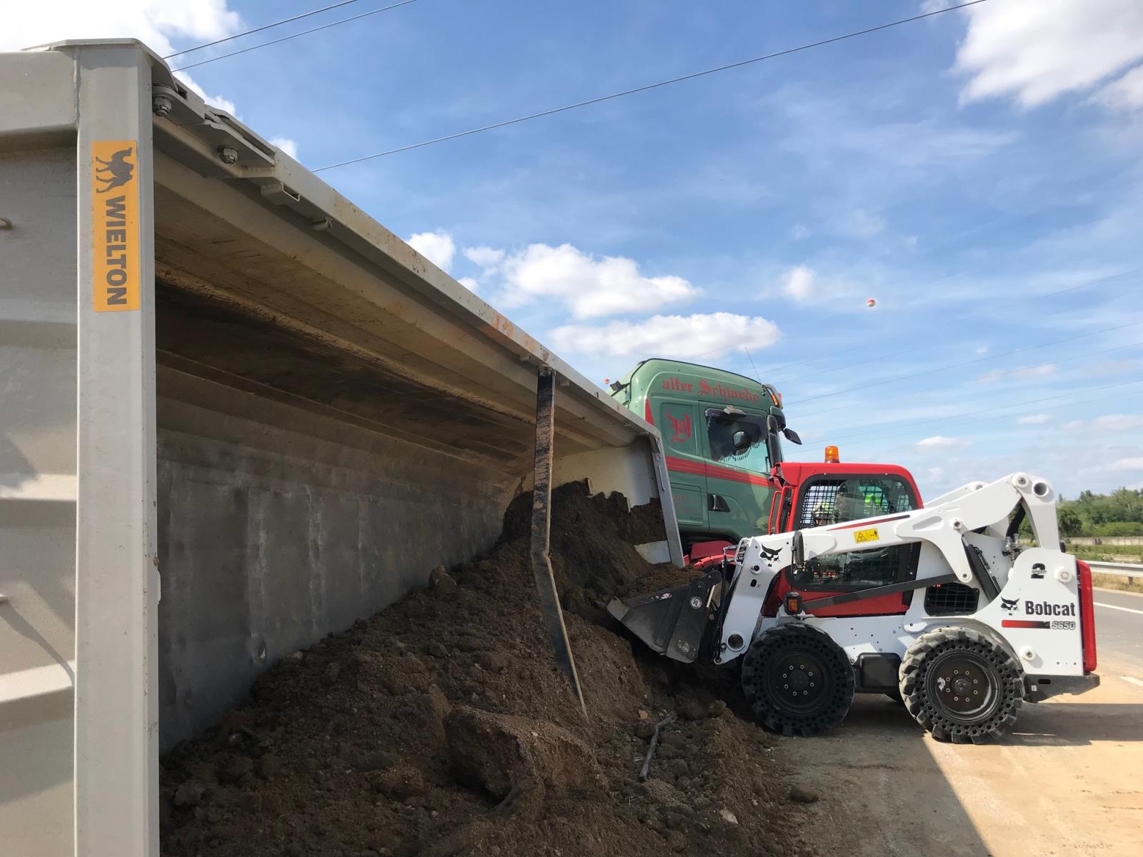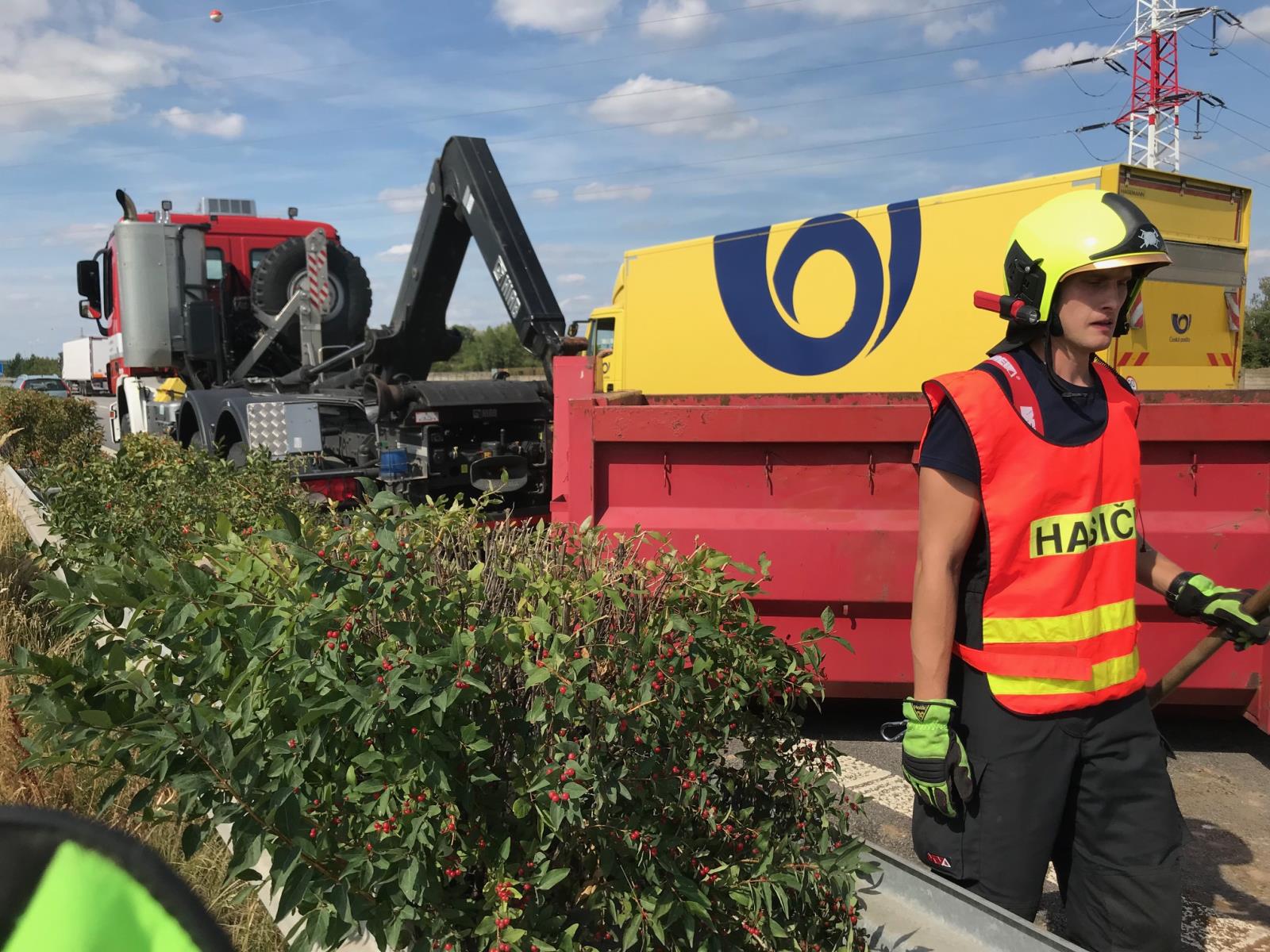 Na místo byla povolána specializovaná firma Vápeník pro odtah vozidla. Ten se ale mohl uskutečnit až po naložení hlíny z převráceného návěsu hasičským nakladačem, který ihned zamířil na místo zásahu ze stanice Pardubice. Hasiči museli pracovat velmi rychle, protože hrozil masivní únik nafty z nádrží, které se mohly prodřít. Hasiči zajistili vozidlo proti dalšímu převrácení. Nafta byla z nádrží přečerpána a hlína přesunuta zhruba o 200 metrů dále od místa nehody tak, aby mohl být obnoven bezpečný provoz na silnici. Odstraňování následků nehody trvalo až do 18.56 hodin.