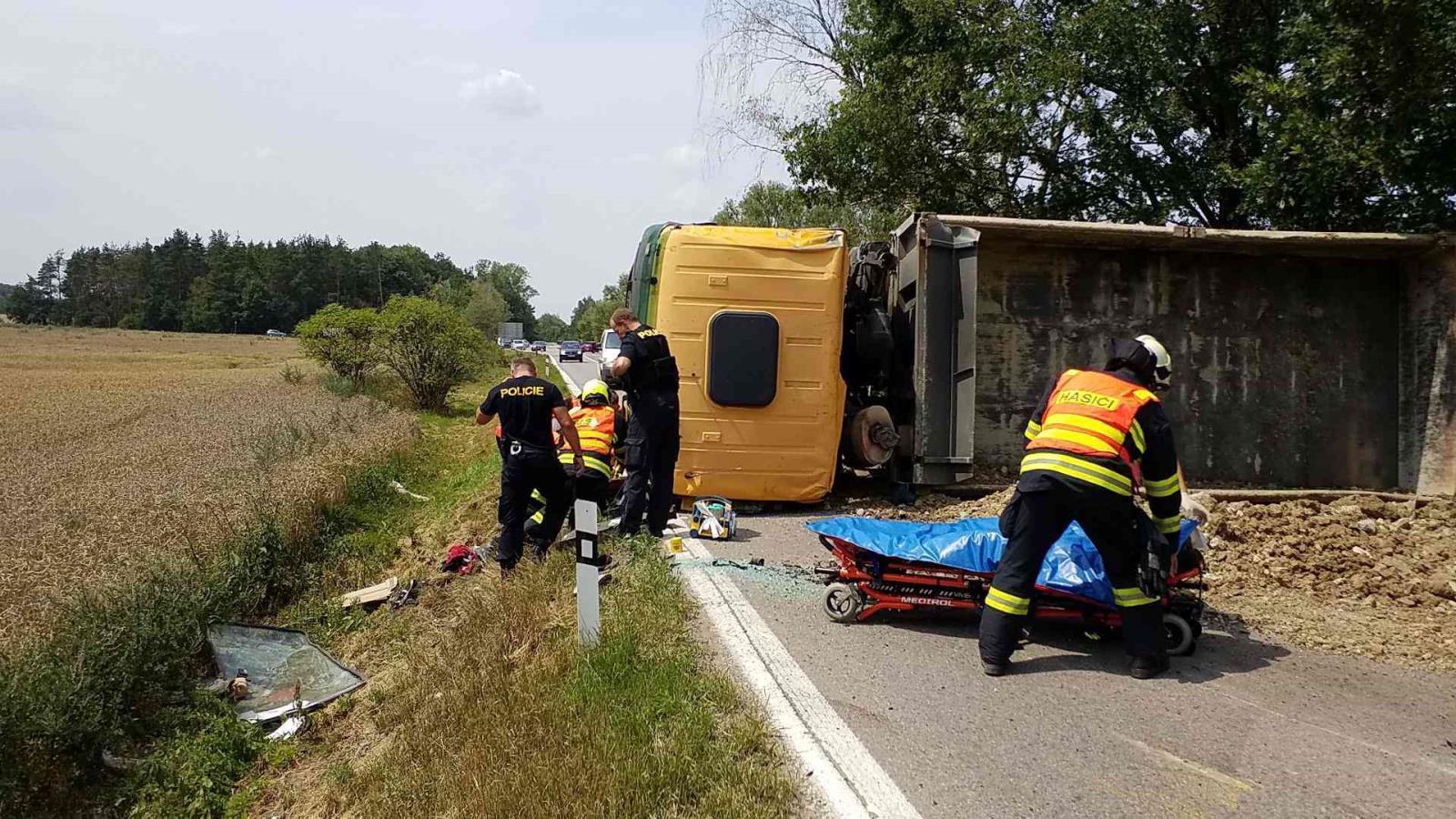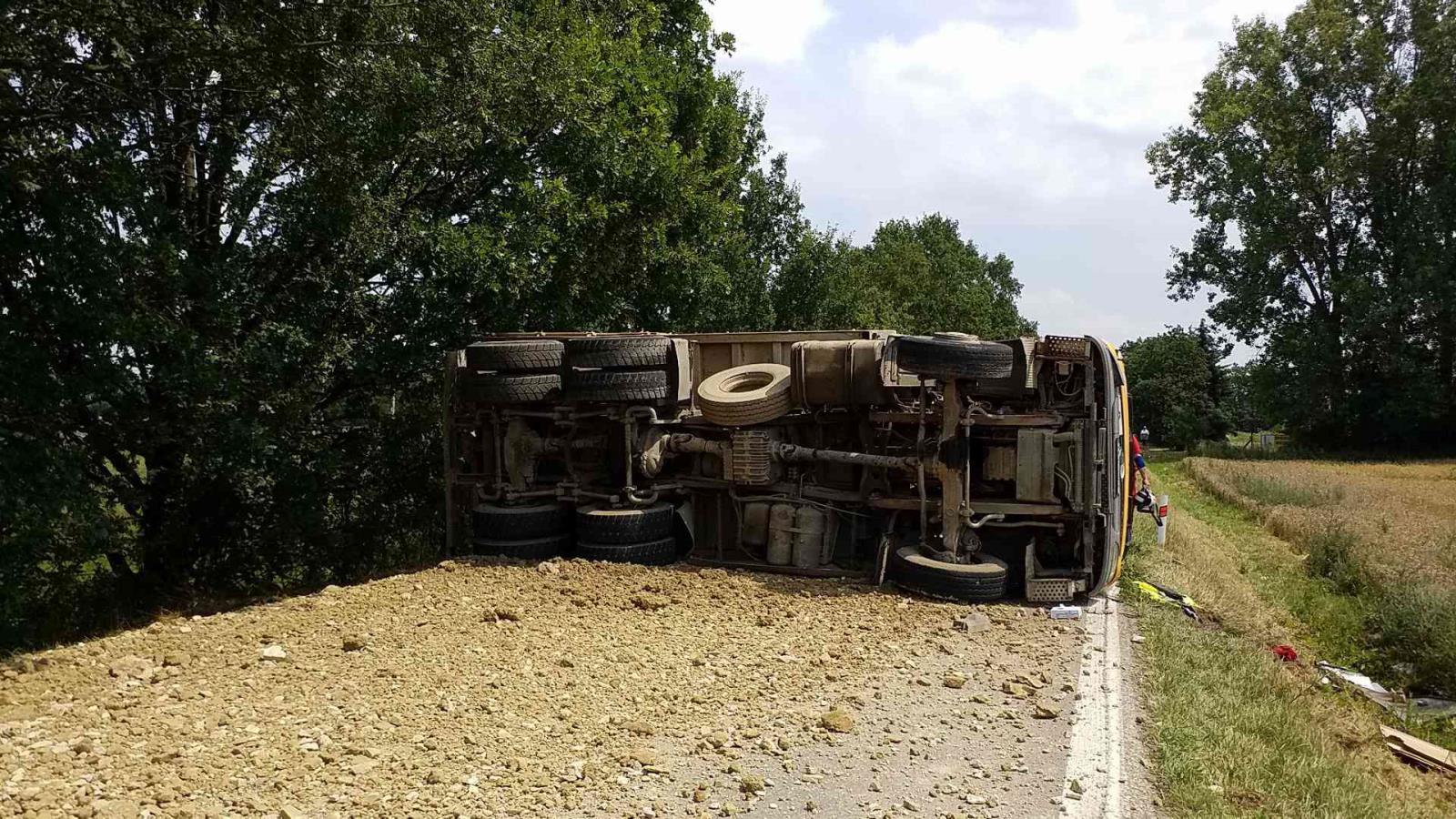 Nákladní automobil plně naložený štěrkem havaroval u Přelouče a zcela zatarasil silnici.