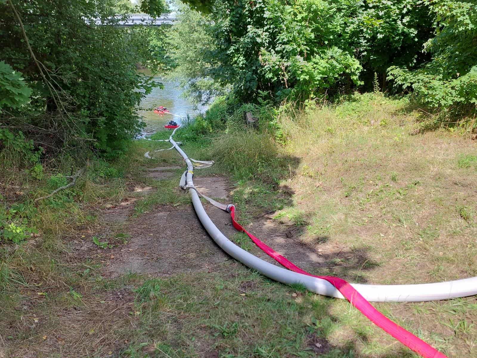 Hasiči zároveň zřídili čerpací stanoviště v obci Labské Chrčice a zorganizovali kyvadlovou dopravu vody, která byla nezbytná pro trvalé hašení a skrápění materiálu.