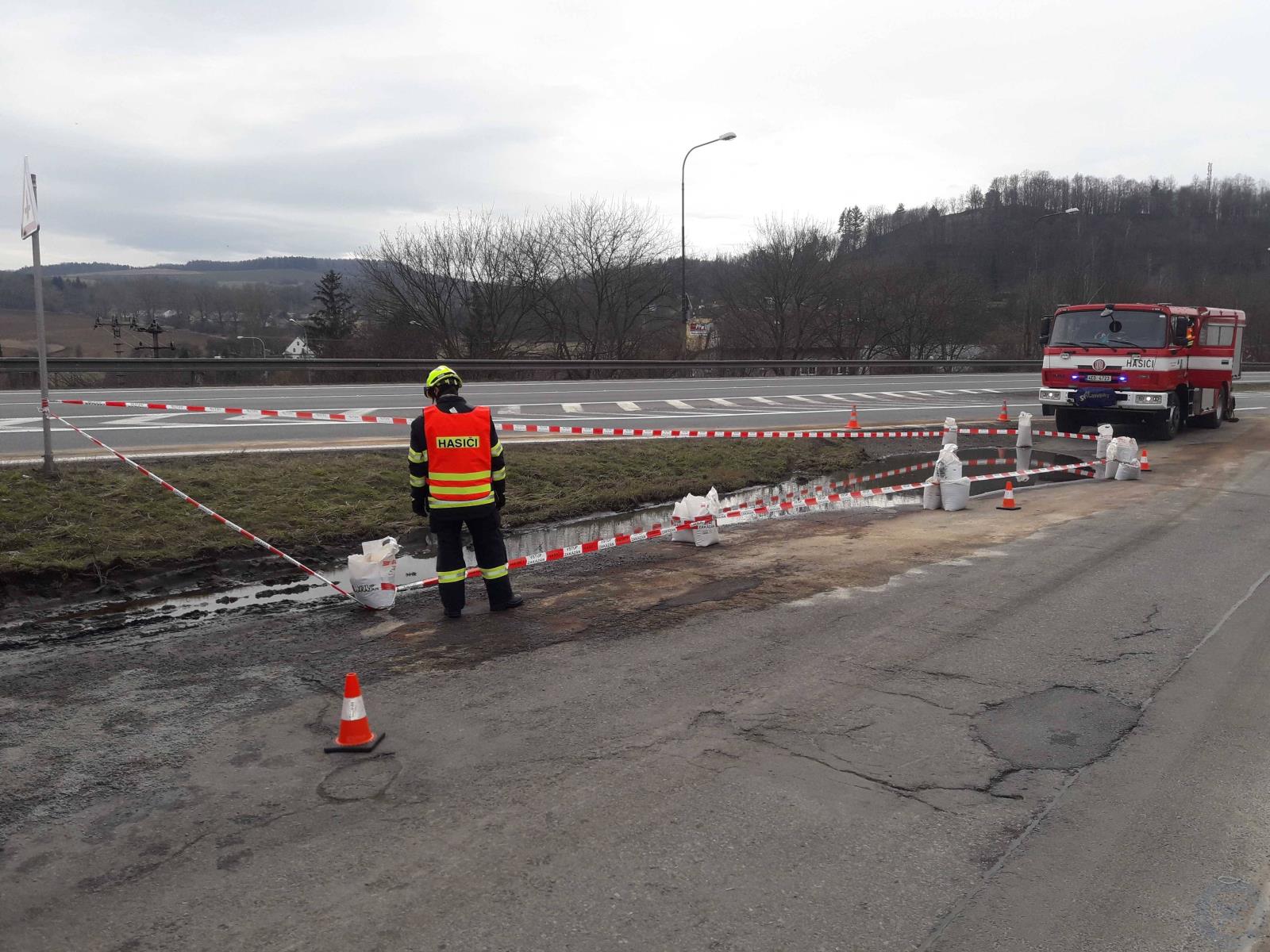 Hasiči provedli úklid komunikace od použitého sorbentu a označili místo události. O lagunu s naftou se postará firma, která havárii způsobila.