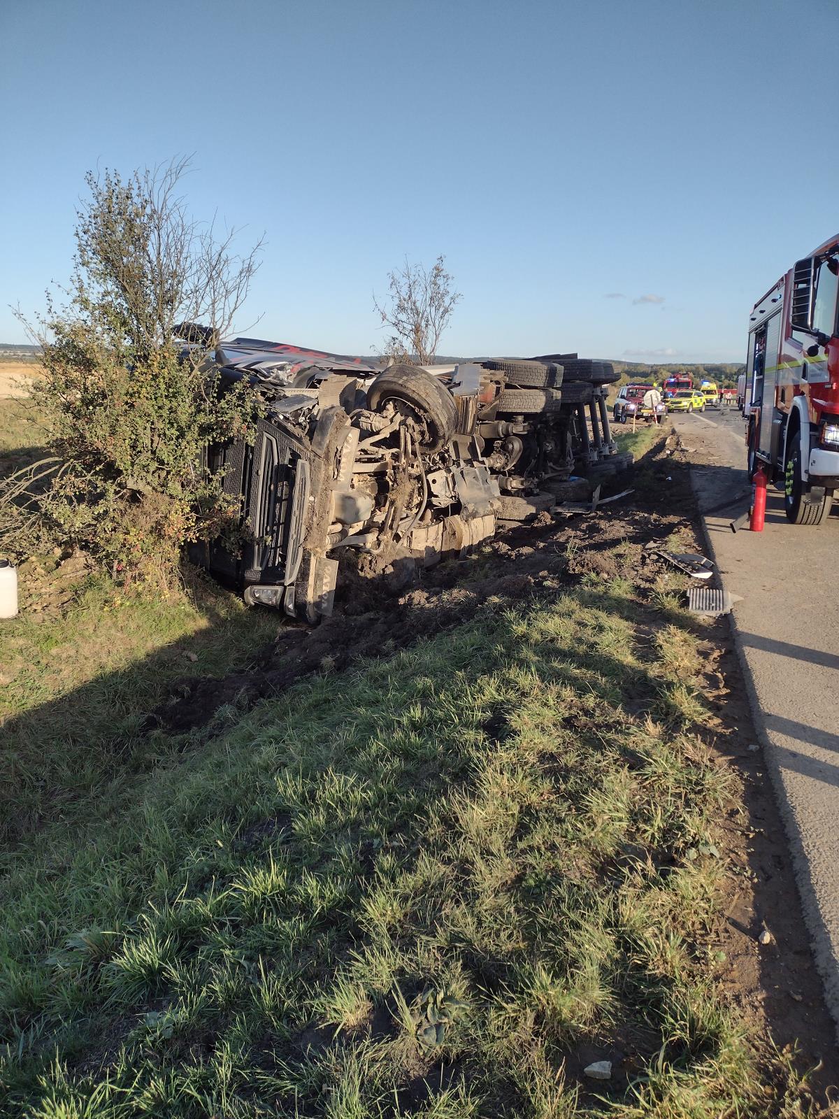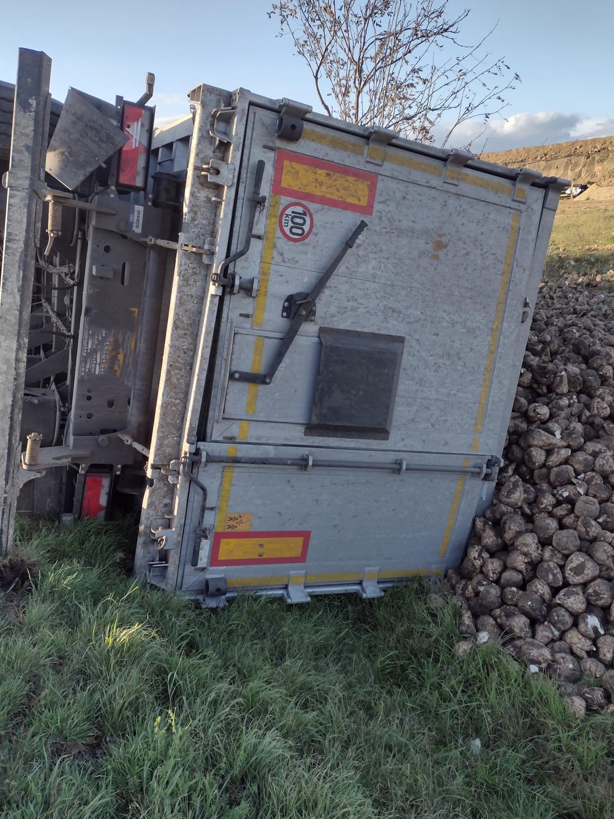 Nákladní automobil převážející řepu skončil na boku a náklad byl v místě nehody rozsypán.