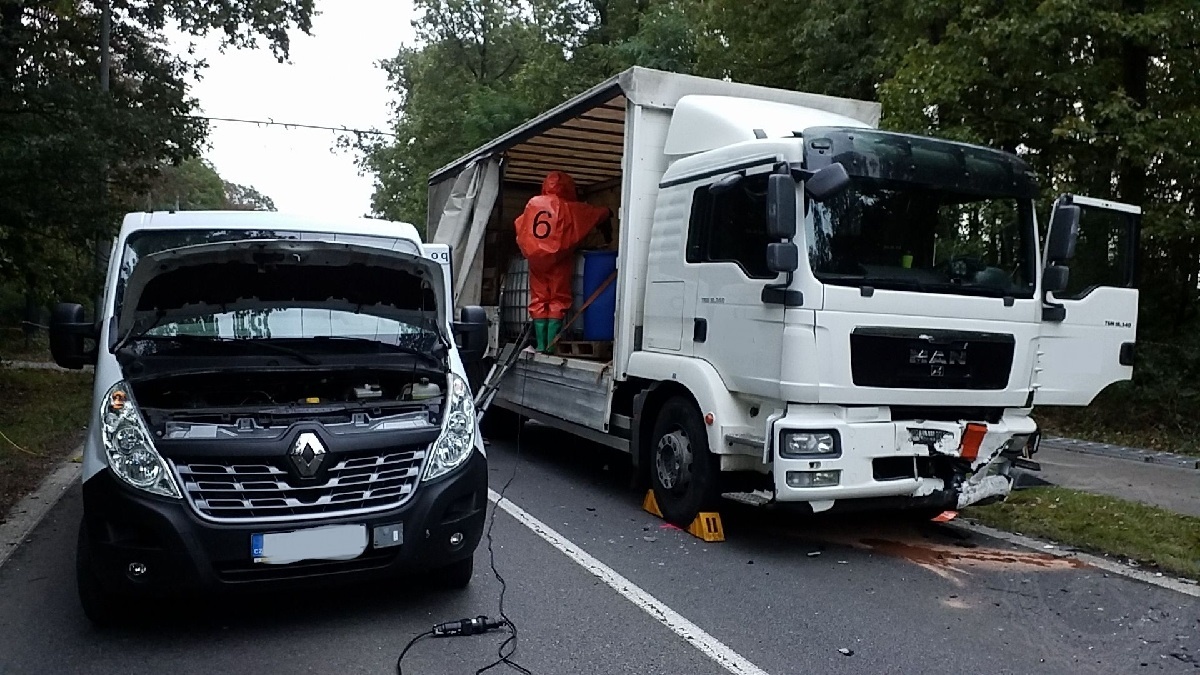 Komplikací pro zásah hasičů byla přítomnost tisícilitrové nádoby s nebezpečnou látkou, která byla při nehodě poškozena a látka začala z nákladního vozu vytékat. Velitel hasičů ihned rozhodl o taktice zásahu na nebezpečnou kapalinu. Hasiči uzavřeli místo nehody, vytyčili nebezpečnou zónu, zjištěna byla meteorologická situace (změřena síla větru i jeho směr, teplota ovzduší atd.). Podle nákladového listu a označení dle ADR byl zjišťován přesný druh nebezpečné látky a proveden následný průzkum. Jednalo se o formaldehyd. Pro toxicitu a těkavost je působení této látky hrozbou pro lidské zdraví. Hasiči se vystrojili do přetlakových obleků. K úniku látky do půdy naštěstí nedošlo. Hasičům se podařilo včas zachytit látku do nádoby a barel zajistit tak, aby nedošlo k dalšímu úniku. Následně byl formaldehyd přečerpán z poškozeného barelu do nové nádoby.