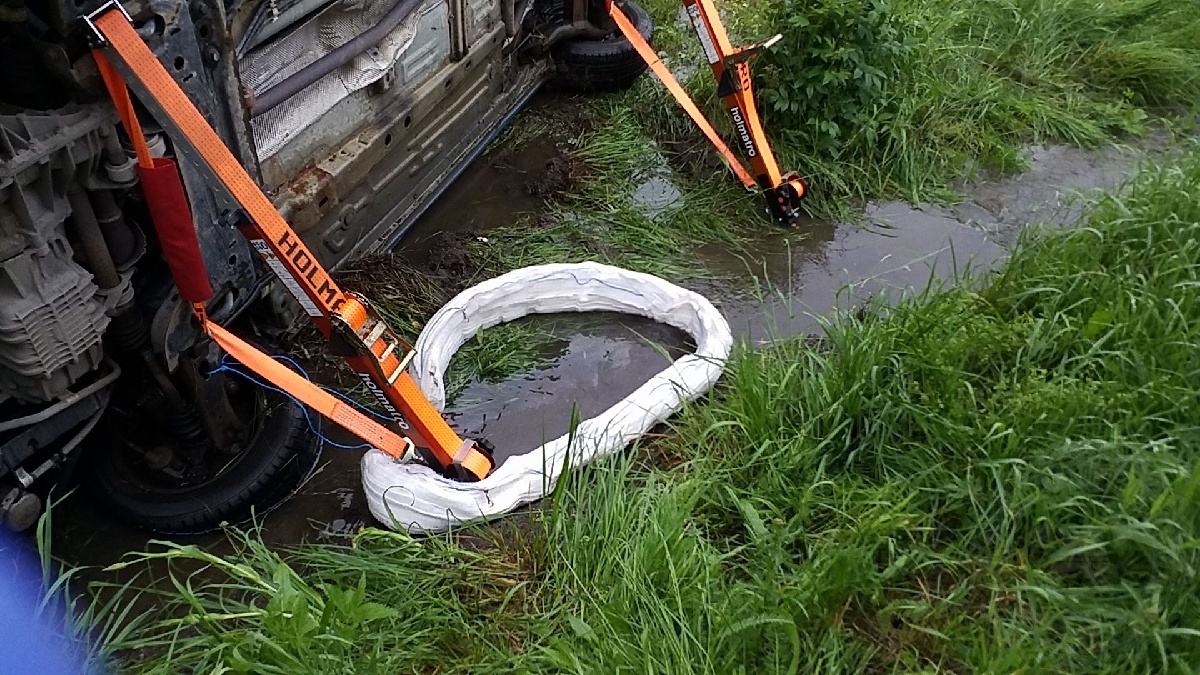 Vozidlo bylo standardně zajištěno proti pohybu i úniku provozních náplní. Auto na boku skončilo částečně v laguně po dešti, a tak bylo nutné uniklé provozní náplně zachytit pomocí sorpčních hadů.