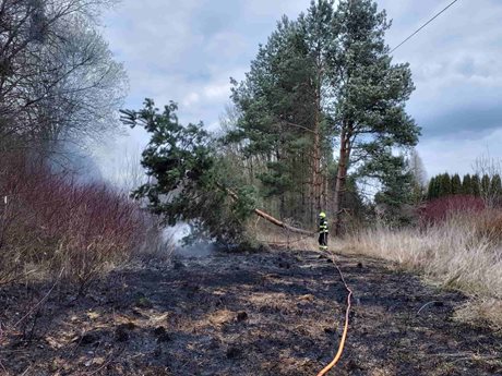 Hasiči zasahovali u požáru porostu, který vznikl po pádu stromu na elektrické vedení. Situace představovala riziko dalšího šíření ohně i ohrožení okolí.