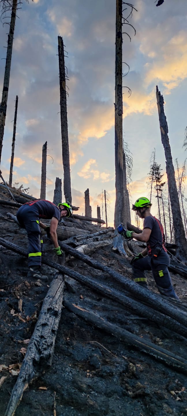 Pro hasiče byl předposlední den ve znamení bezpečnostních průseku a vyhledávání a hašení skrytých ohnisek nad Divokou Soutěskou. „Aby bylo možné zasahovat ve zmíněném úseku, museli jsme zmonitorovat a vytvořit ve spolupráci se Záchranným útvarem Zbiroh přístupové cesty. Minimálně polovina úseku byla kontrolována lezeckým družstvem, které v nepřístupném terénu odhalilo asi deset menších požárů v kořenovém systému a následně provedlo jejich likvidaci,“ přibližuje složitou a náročnou práci pprap. Michal Vraný z HZS Pardubického kraje. Druhá skupina prováděla preventivní ochlazování hranice mezi požářištěm a nezasazenou části lesa. V závěru dne jsme ještě vytvořili bezmála půl kilometrové dopravní vedení z nejbližší přístupné lesní cesty až k požářišti, které zde zůstane umístěno po několik dní a urychlí tak případný zásah místních jednotek v případě znovu rozhoření požáru.