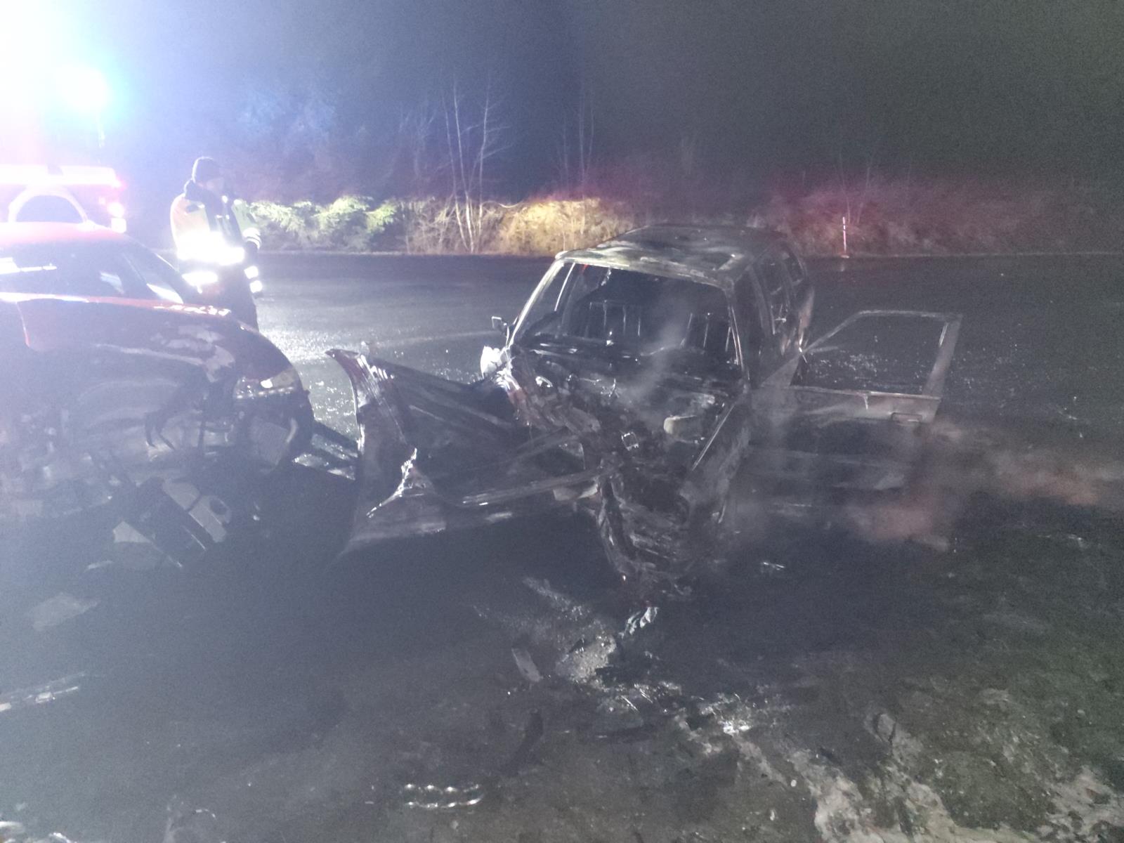 Po střetu dvou osobních aut začalo jedno vozidlo hořet