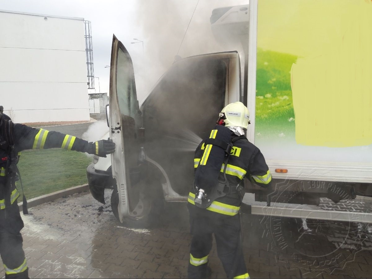 Řidič dodávkového vozidla v Pardubicích dnes dopoledne 4. září zastavil u restaurace, vyložil zboží a při vyzvednutí dokumentů z kabiny vozu si stačil všimnout, že mu začínají šlehat plameny pod motorem.