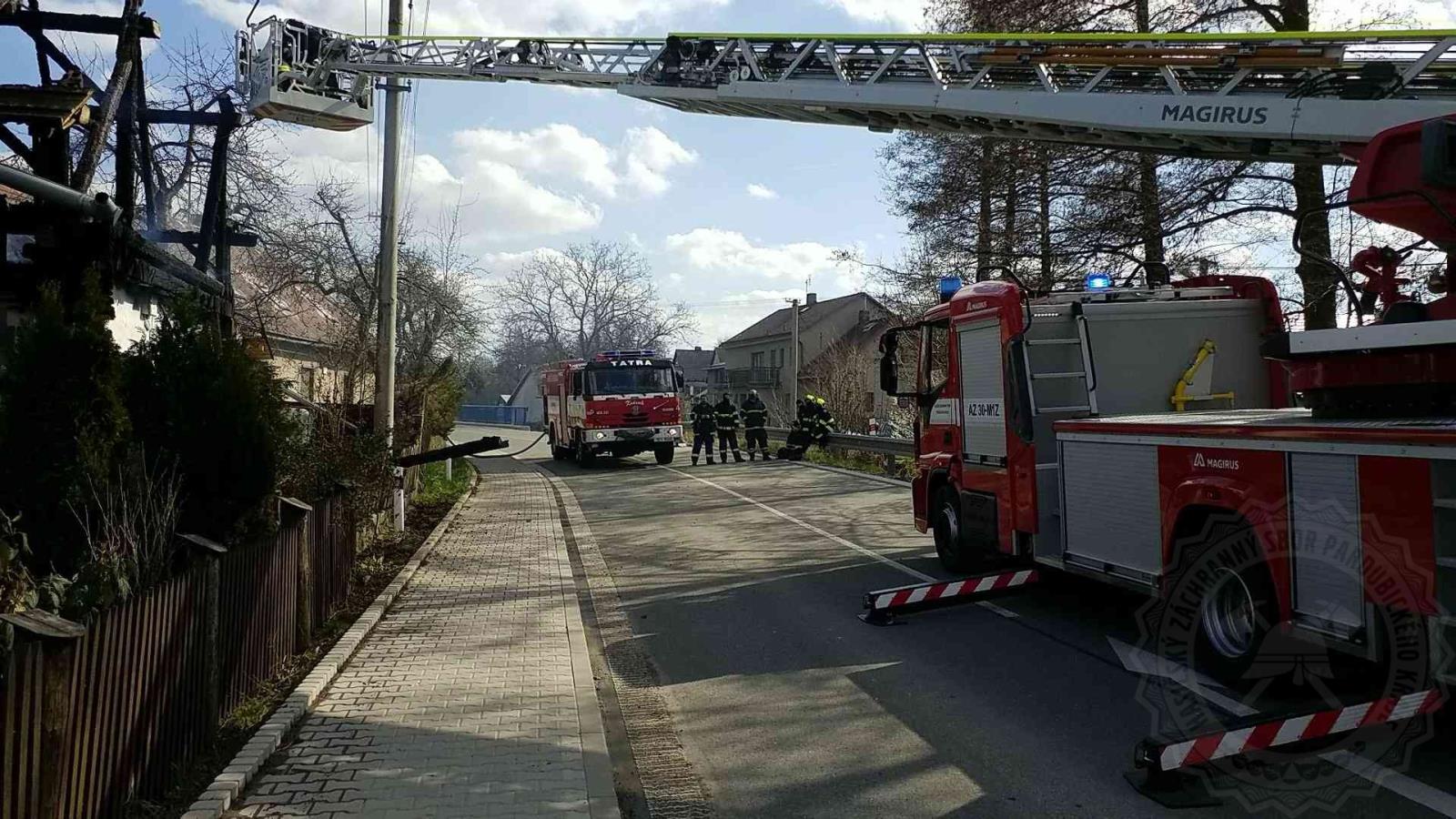 Hasiči z automobilového žebříku museli odřezat krovy a s technikem z pohotovostní služby rozvodných el. závodů zajistili poškozené dráty vysokého napětí.