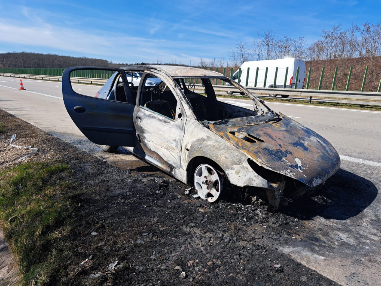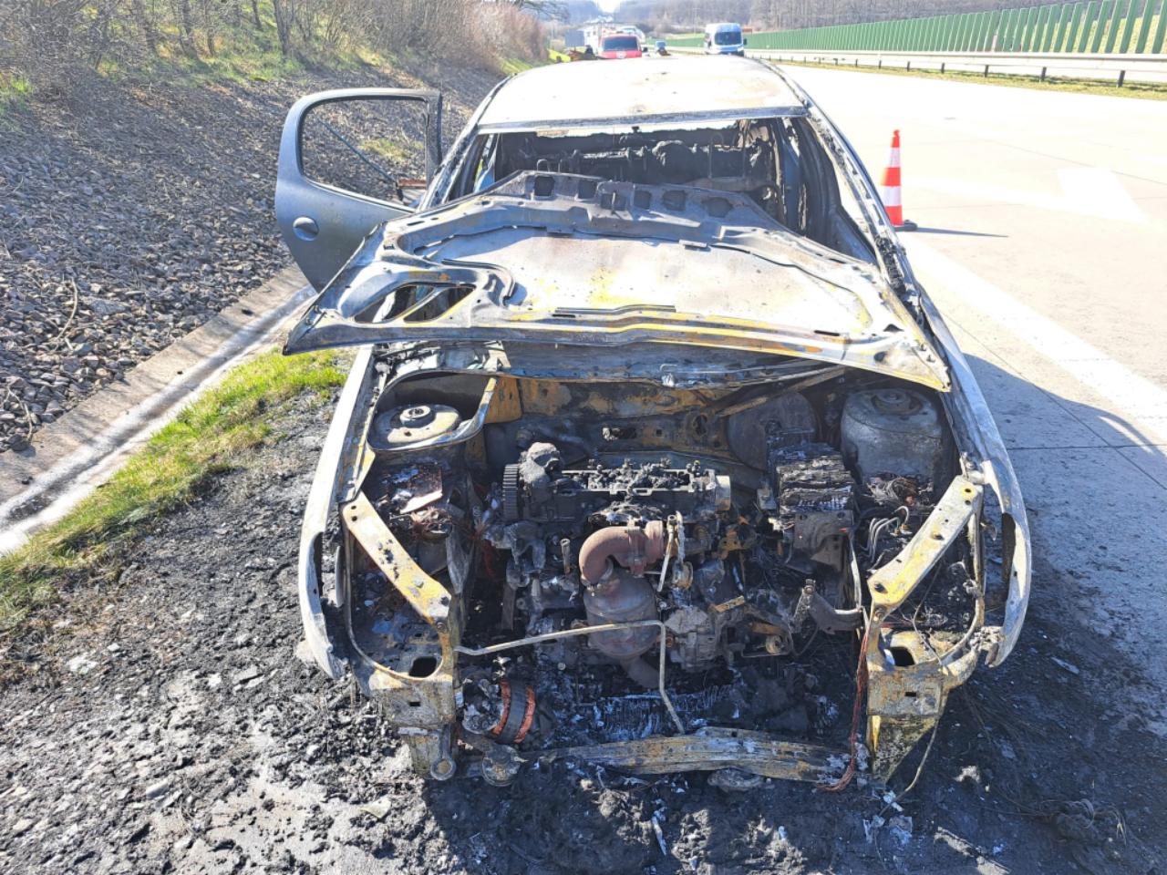 Oznamovatel na tísňovou linku uvedl, že plameny vycházejí z motorové části vozu. Provoz na dálnici byl zastaven. Plameny zasáhly celé vozidlo.  Škoda na vozovce byla vyčíslena na 100 tisíc korun. Škoda na vozidle byla předběžně vyčíslena 20 tisíc korun. Příčinou vzniku požáru byla s největší pravděpodobností technická závada v motorové části vozu.