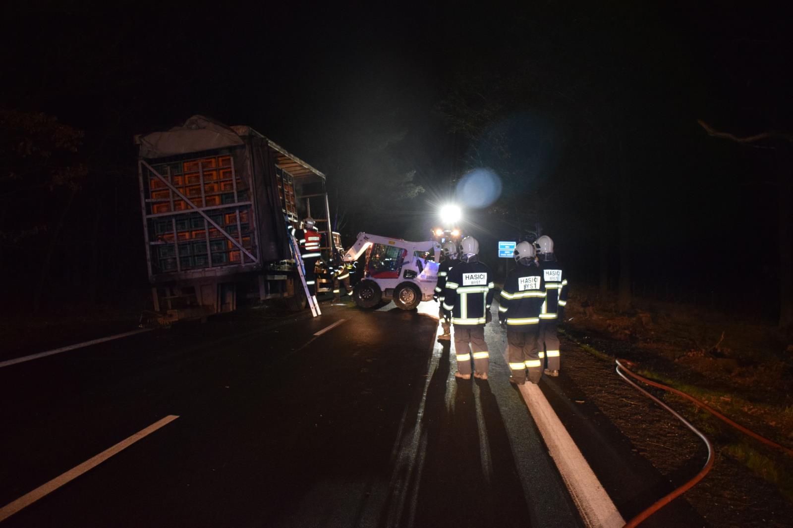 U požáru návěsu na silnici I/35 u Býště zasahovali ve středu 13. prosince v 03.07 hodin profesionální hasiči z Holic, Pardubic i hasiči ze stanice Hradec Králové a dále dobrovolní hasiči z Býště a Holic. Při příjezdu hasičů na místo bylo zjištěno, že hoří návěs s nákladem kuřat. Hasiči ihned museli nejen likvidovat požár, ale vyndávat z návěsu klece s živými kuřaty. Velitel zásahu si na místo nechal povolat vysokozdvižný vozík pro vyndávání klecí. Požár se hasičům podařilo dostat pod kontrolu v 3.32 hodin a zcela zlikvidován byl v 3.46 hodin. Na silnici I/35 musel být po dobu zásahu hasičů zastaven provoz. Náklad kuřat, kterých mělo být přibližně 6 tisíc kusů, byl vyložen na komunikaci a dopravce si zajistil jejich naložení na jiný nákladní automobil.