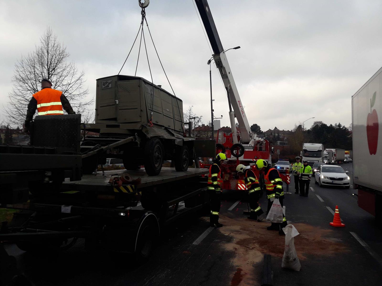 Jednalo se o převrácenou elektrocentrálu na přívěsu u nákladního automobilu. Celkem byly převáženy dvě elektrocentrály. Z převrácené elektrocentrály uniklo asi 10 litrů oleje. Hasiči místo nehody zajistili, uniklý olej zasypali sorpčním materiálem a uklidili vozovku. Poté pomocí hasičského jeřábu byla elektrocentrála zpět postavena na kola a na přívěs. Příčina této kolize je vyšetřována. Naštěstí ve vedlejším odbočovacím pruhu nikdo nestál a nedošlo k žádnému zranění. Odstraňování následků nehody trvalo téměř 3 hodiny.