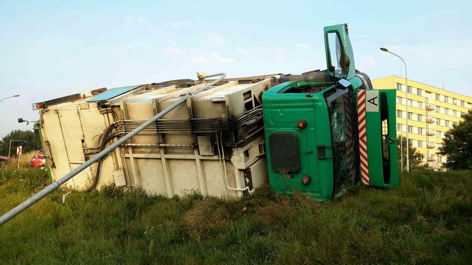 Převrácený popelářský vůz porazil sloup veřejného osvětlení.