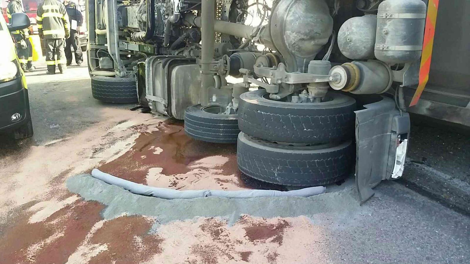 Dále bylo nutné zamezit úniku provozních náplní. Uniklé látky byly posypány sorpčním materiálem. Unikající unik-latek.jpgpohonné hmoty hasiči zachytávali a odčerpávali do sudů. Řidič měl totiž všechny nádrže plné nafty.