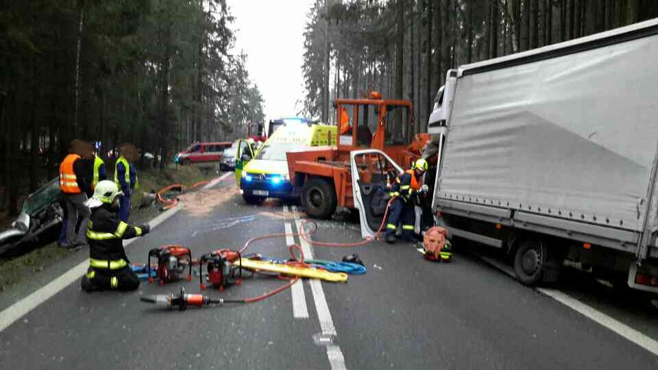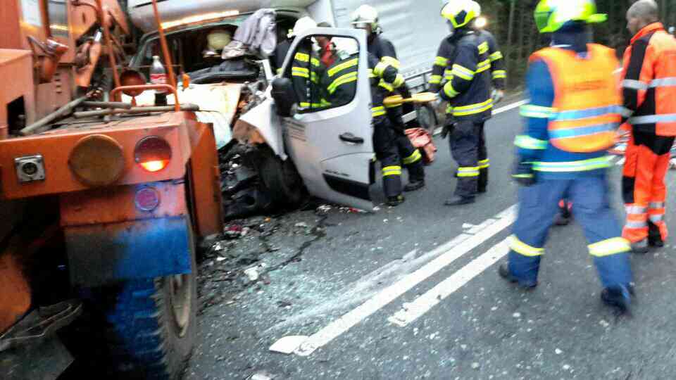 Střetly se zde dodávka, nakladač a osobní automobil. Ihned po příjezdu na místo bylo nutné vyprostit ze zdemolované dodávky zaklíněného řidiče.