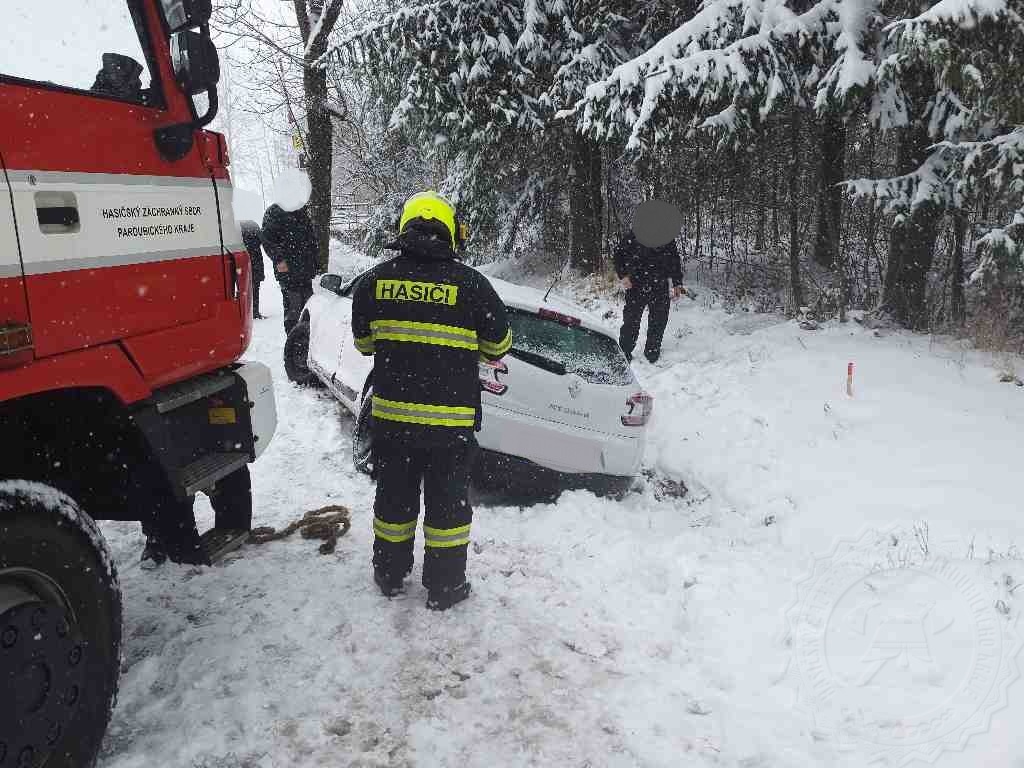V průběhu dne hasiči Pardubického kraje vyprošťují zapadlá auta (tyto události jsou bez zranění) nebo odstraňují nalomené větve, které hrozí pádem na chodník či vozovku.