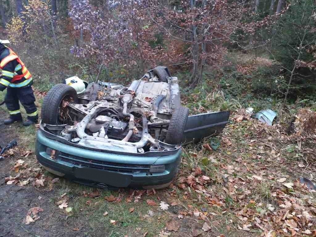 Osobní auto na střeše mimo komunikaci a uvnitř zaklíněná osoba. Dopravní nehoda mezi Skutčí a Podlažicemi na Chrudimsku v pátek 19. listopadu ráno.