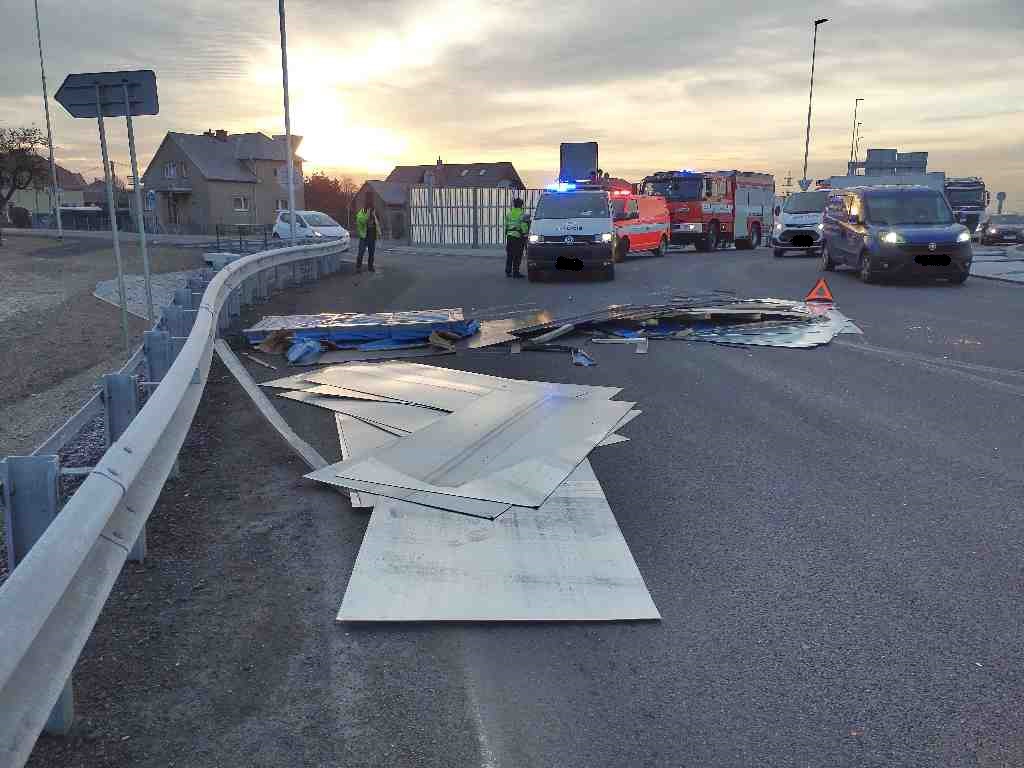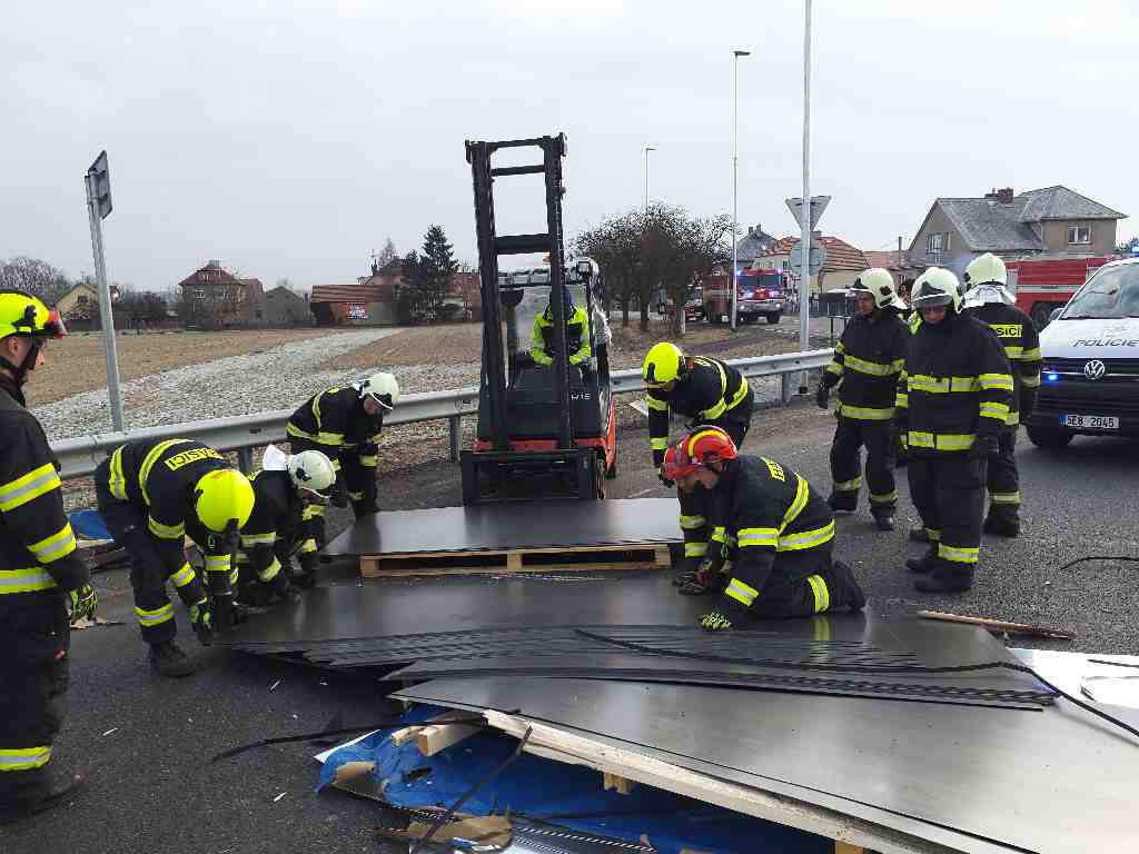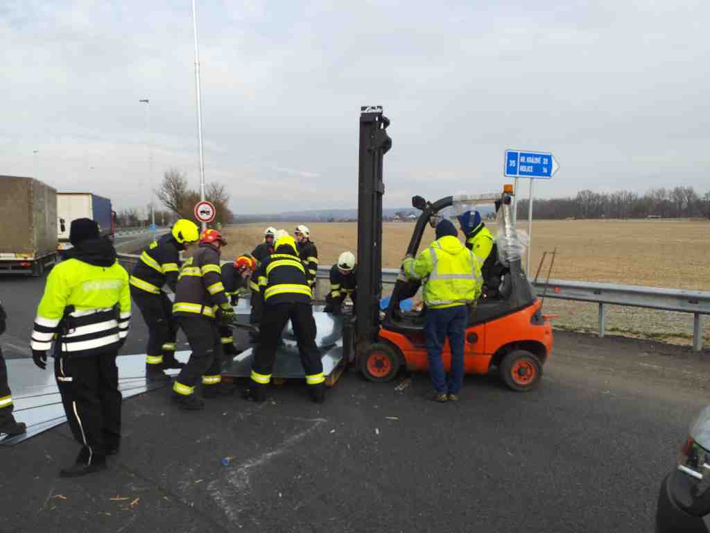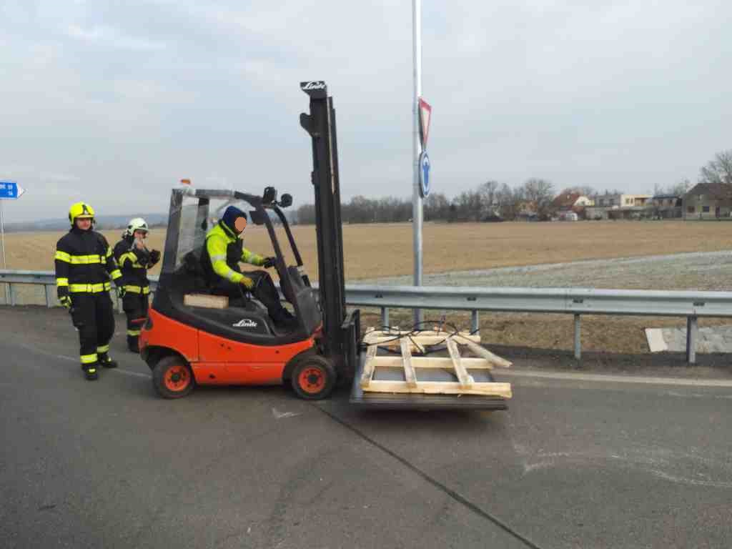 Hasiči ze stanice  Vysoké Mýto a ze stanice Pardubice vyjížděli dnes po sedmé hodině ranní k rozsypanému nákladu na kruhovém objezdu v Nové Vsi u Zámrsku.  Řidiči kamionu se při odbočování ze směru od Vysokého Mýta na Chrudim uvolnili kurtovací popruhy, které jistily 3  palety s válcovanými plechy. Ty protrhly plachtu návěsu a  vysypaly se na vozovku. Současně s kamionem nejelo zrovna žádné vozidlo, takže nedošlo k poškození dalších vozidel ani zranění  účastníků silničního provozu. Hasiči z Vysokého Mýta chtěli nejdříve odklidit rozsypaný náklad  vysokozdvižným vozíkem, ale plechy byly na tento druh vozidla těžké. Jedna paleta vážila 2500 kg . Na místo byla tedy ještě povolána jednotka z Pardubic s nakladačem Bobcat a tím se nakonec podařilo  rozsypaný náklad z vozovky odstranit a naložit zpět na kamion, který mohl po zabezpečení plechů odjet po vlastní ose. Během odstraňování překážek z vozovky byla na místě řízená doprava kyvadlově.