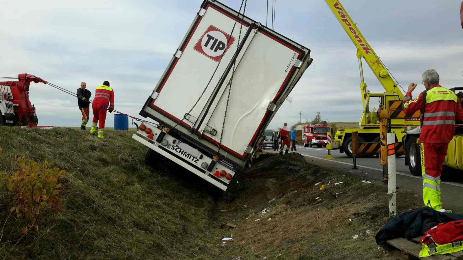 Kamion plně naložený sušenkami se převrátil na bok. Řidič utrpěl při kolizi zranění a byl převezen posádkou zdravotnické záchranné služby do nemocnice.