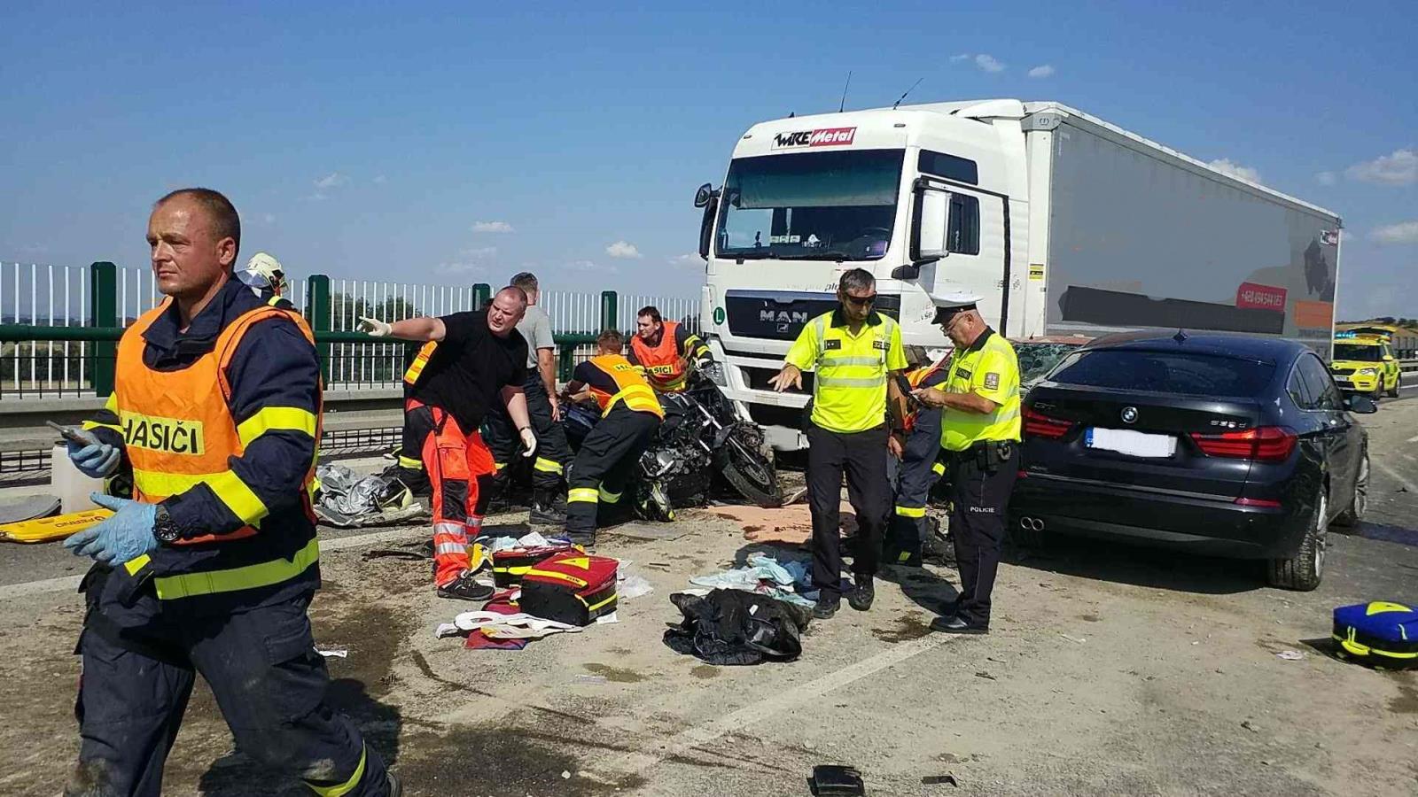 Na místě byly dvě těžce zraněné osoby z motocyklu a jedna osoba z osobního vozidla, která byla zasypána převážející betonovou směsí.
