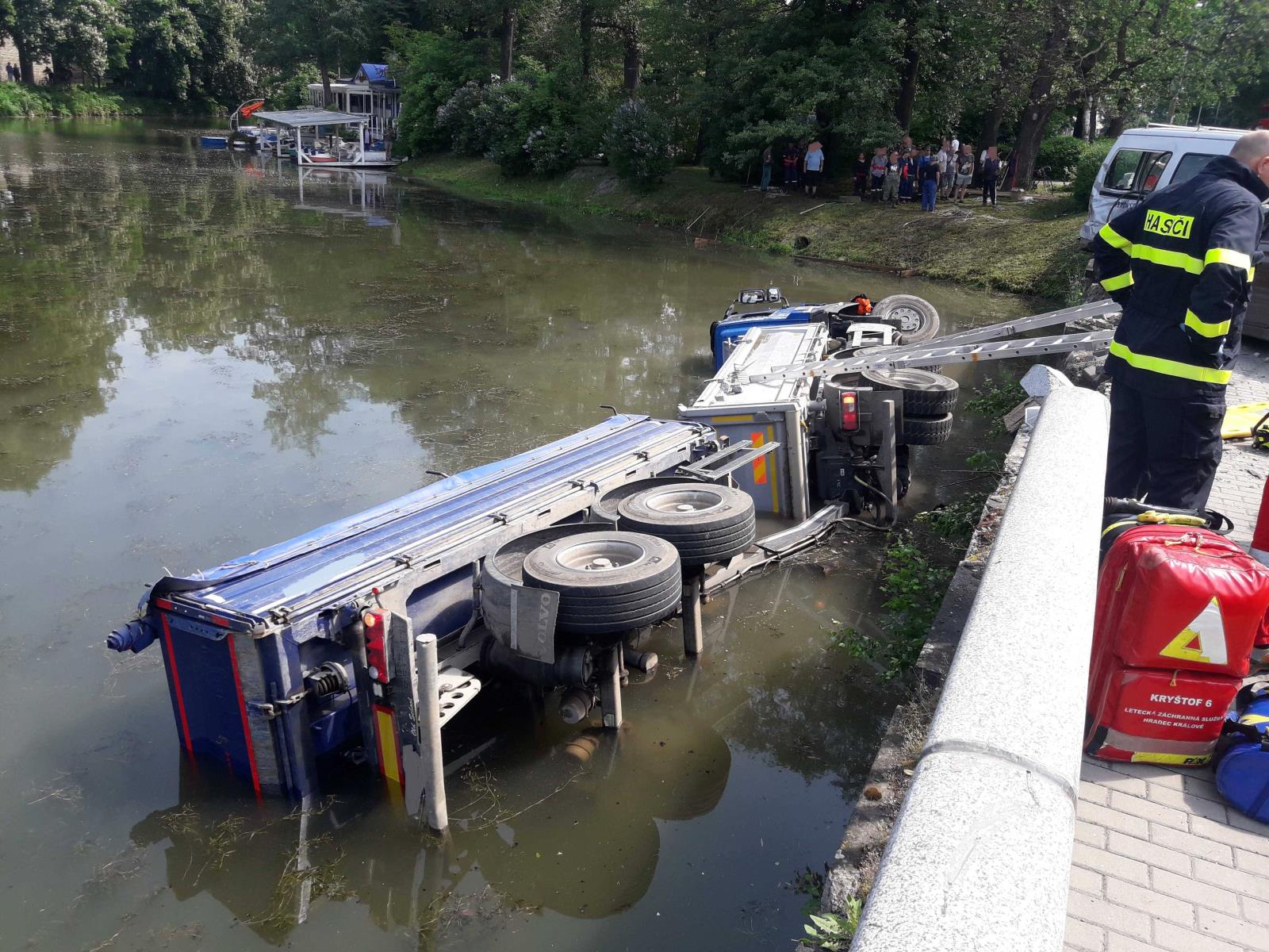 Řidič nákladního auta z neznámých důvodů narazil do tří osobních vozidel, probořil zábradlí a skončil v rybníku. Muže z kabiny vyprostili hasiči a spolu se zdravotníky začali s resuscitací. Bohužel přes veškerou snahu záchranářů muž na místě zemřel.