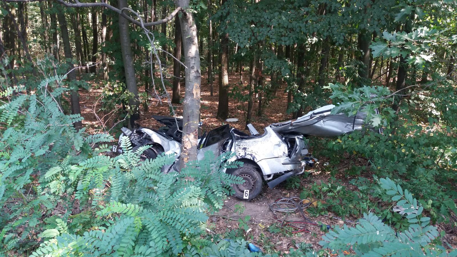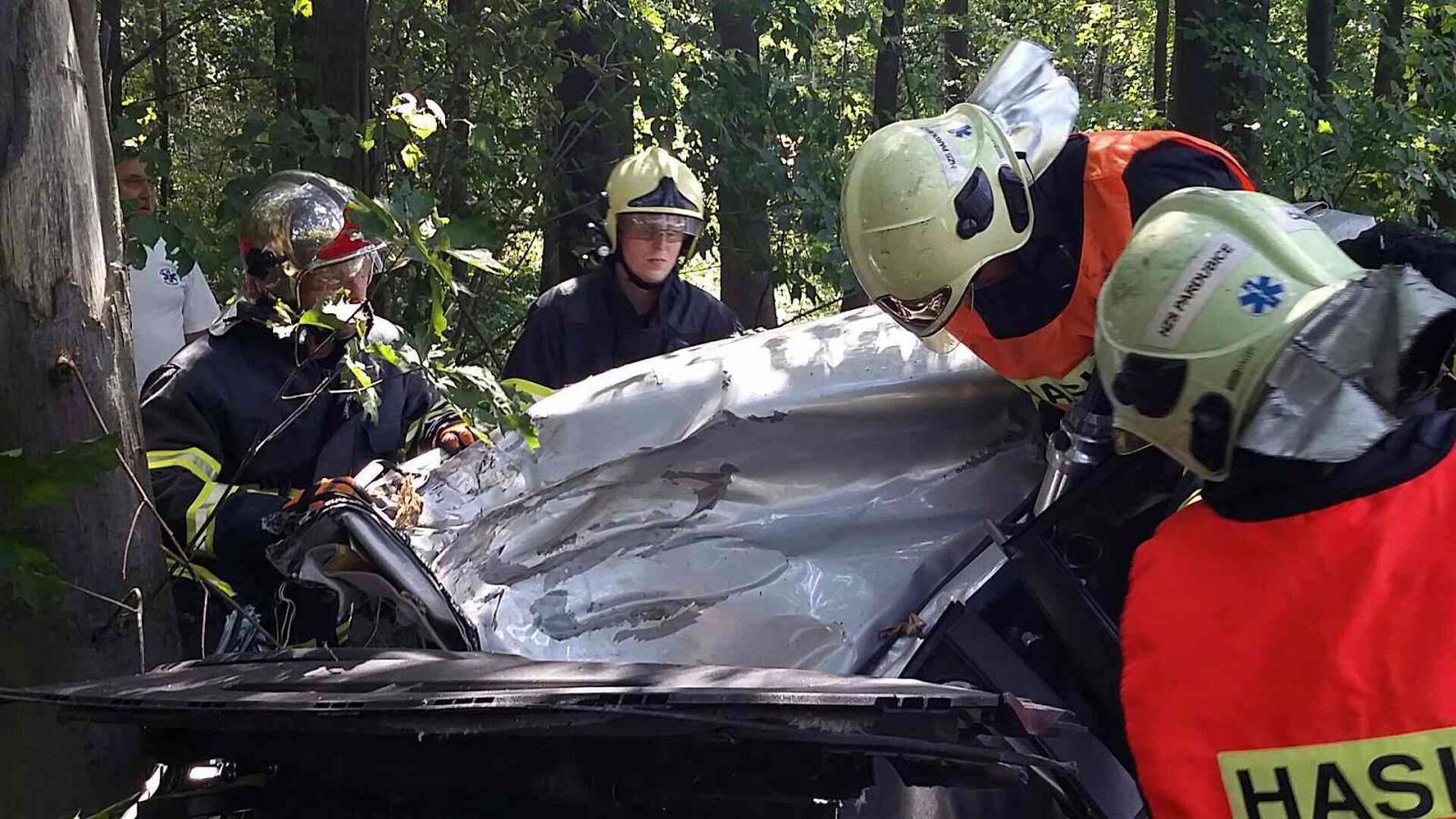 Jednalo se o náraz osobního vozu mezi stromy. Ve voze zůstaly zaklíněny dvě osoby – dospělá osoba a dítě. Hasiči ihned započali s vyprošťováním zaklíněných osob.