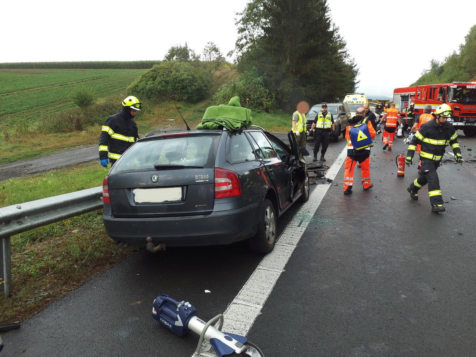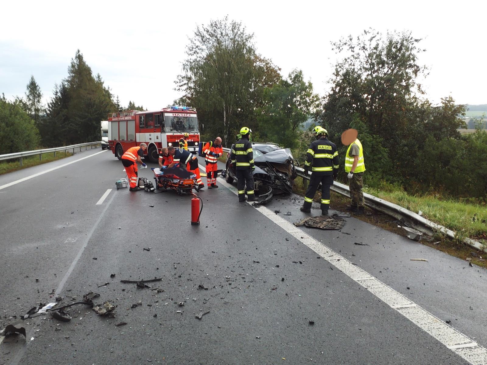 Hasiči ze zcela zdemolovaného osobního vozu museli vyprostit pomocí hydraulického vyprošťovacího zařízení dvě osoby.