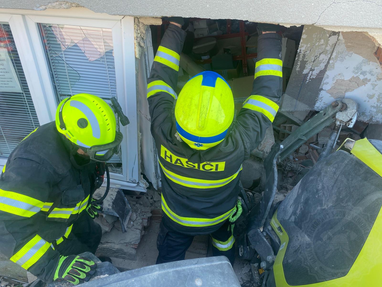 Na místo se dostavil i statik. Hasiči museli také ihned stabilizovat dům pomocí pažení ještě před odtržením zaklíněného traktoru ve zdi domu, aby nedošlo ke zřícení stavby.