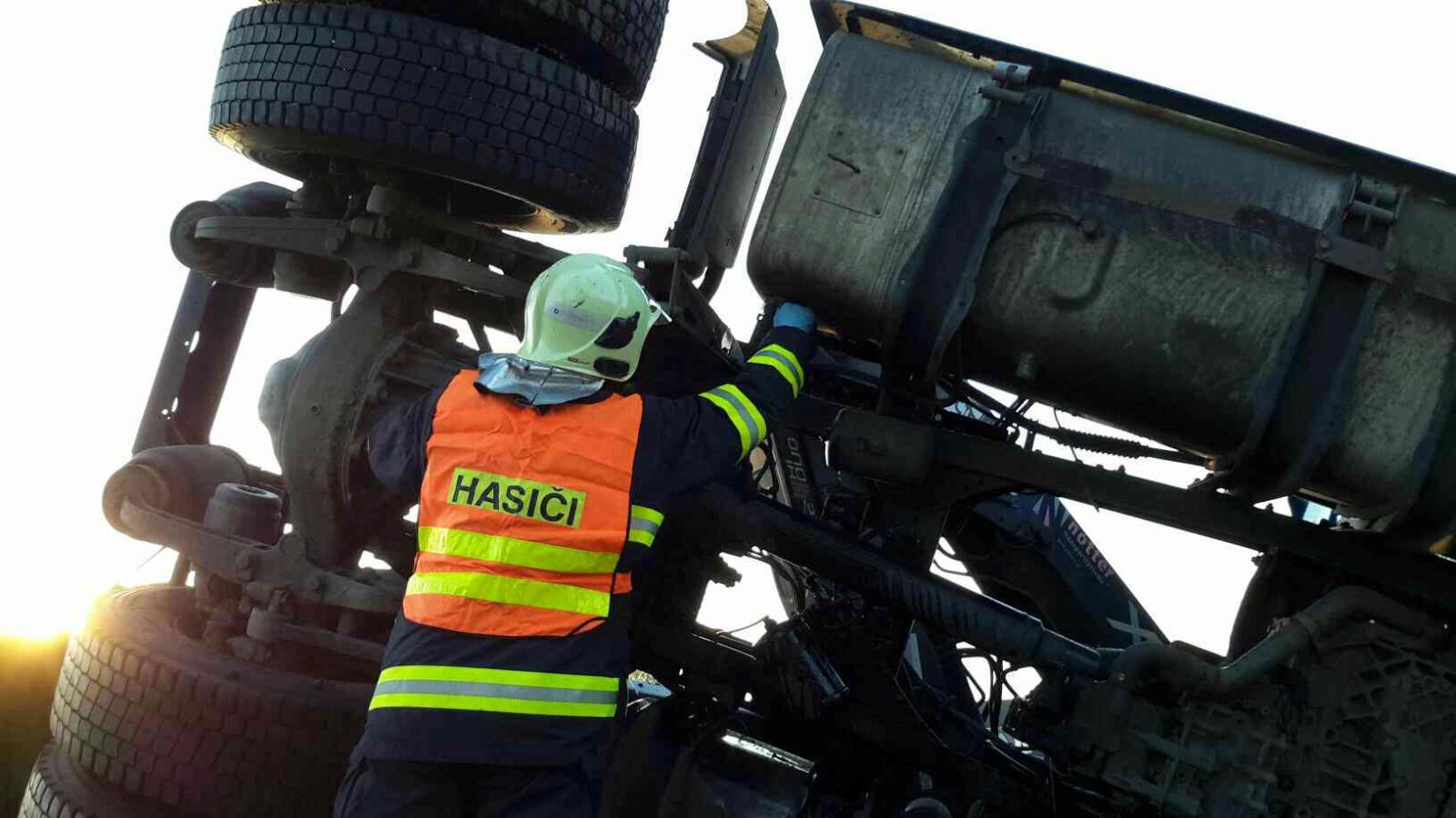 Jednalo se o kolizi kamionů – jeden kamion táhl druhého a z dosud nezjištěných příčin došlo k nehodě. Hasiči na místě ihned museli zachytávat unikající naftu z kamionu. Dále bylo nutné zajistit stabilitu vozidla tak, aby nedošlo k pádu druhého kamionu. Při kolizi nebyl nikdo zraněn. Na místo byl povolán vyprošťovací speciál, kterým byl postupně kamion vyproštěn. Rozříznuta byla i tyč, kterým byly vozy spojeny. Při vyprošťování docházelo k dalším únikům nafty. Včas se únik podařilo hasičům zastavit. Silnice I/35 byla po dobu odstraňování následků neprůjezdná. Zásah hasičů byl ukončen v 23.23 hodin. Příčiny nehody vyšetřují policisté.