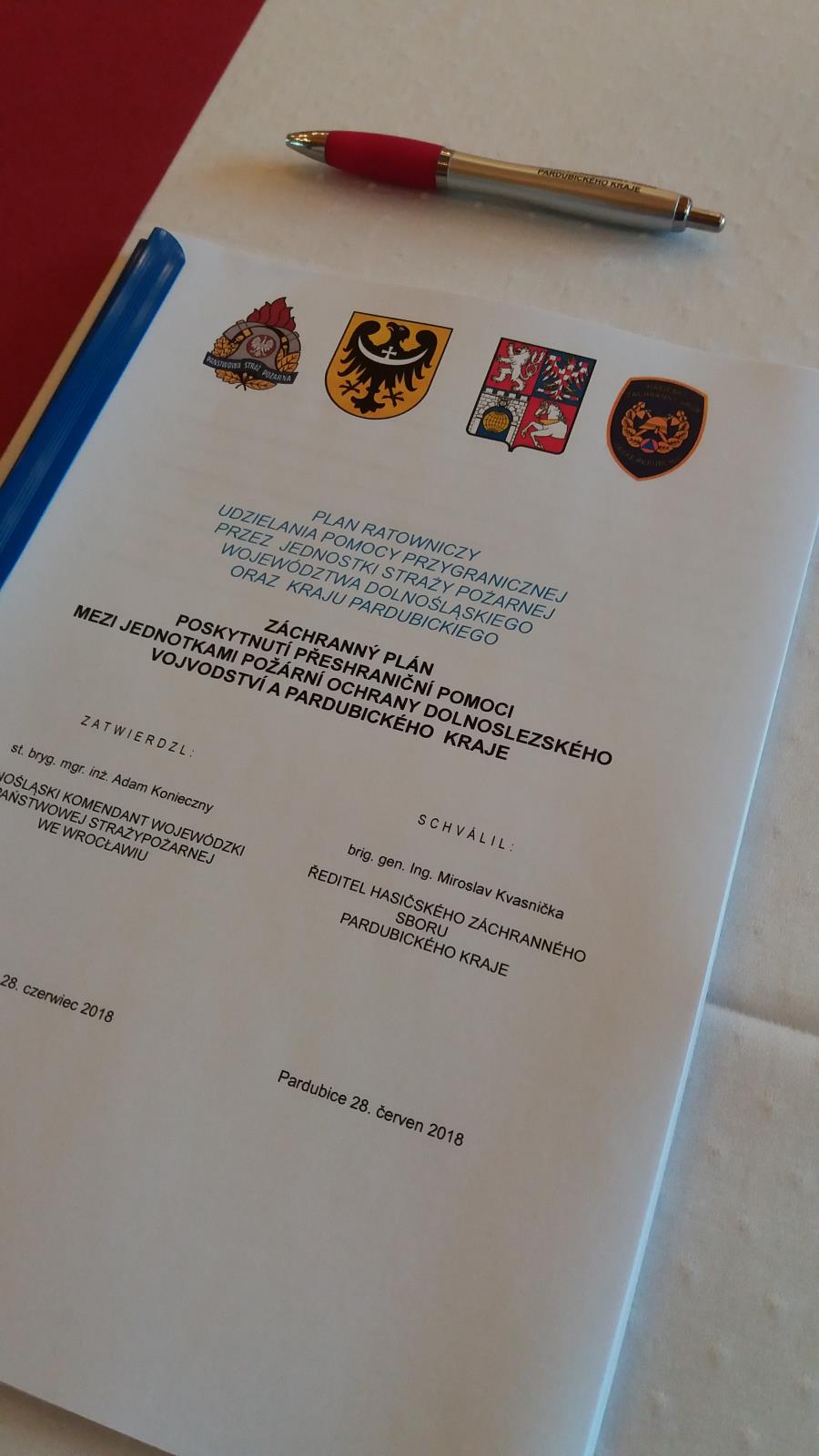 Záchranný plán dnes podepsali mezi sebou st. bryg. mgr. inż. Adam Konieczny DOLNOŚLĄSKI KOMENDANT WOJEWÓDZKI PAŃSTWOWEJ STRAŻYPOŻARNEJ WE WROCŁAWIU a brig. gen. Ing. Miroslav Kvasnička ŘEDITEL HASIČSKÉHO ZÁCHRANNÉHO SBORU PARDUBICKÉHO KRAJE.