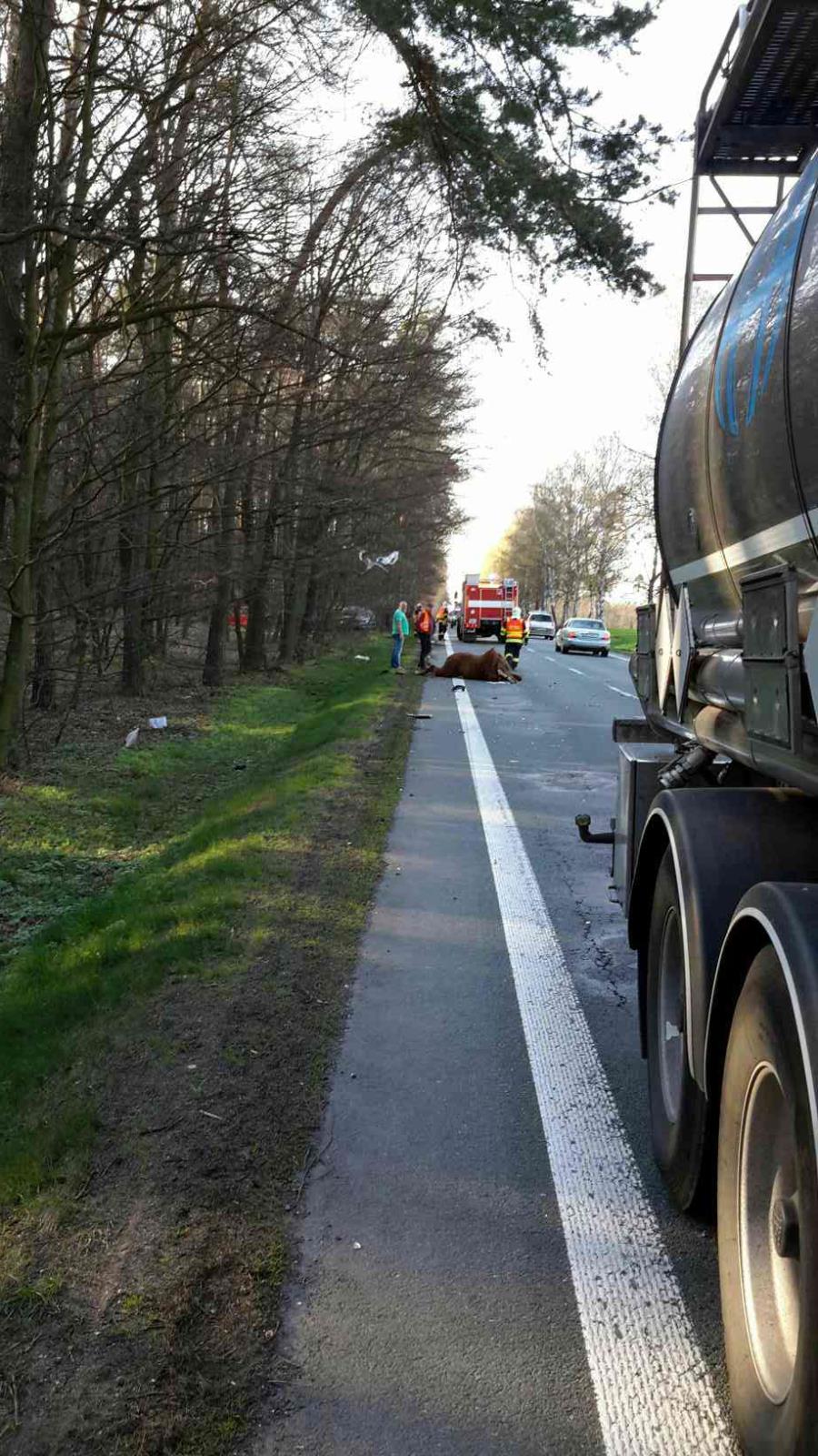 Hasiči z Holic odstraňovali v neděli 2. dubna v 17.17 hodin v Býšti na frekventované silnici I/35 následky střetu kamionu s koněm. Zvíře náraz nepřežilo a bylo naloženo na valník připojený k traktoru. Odstranění následku trvalo až do 19.42 hodin.
