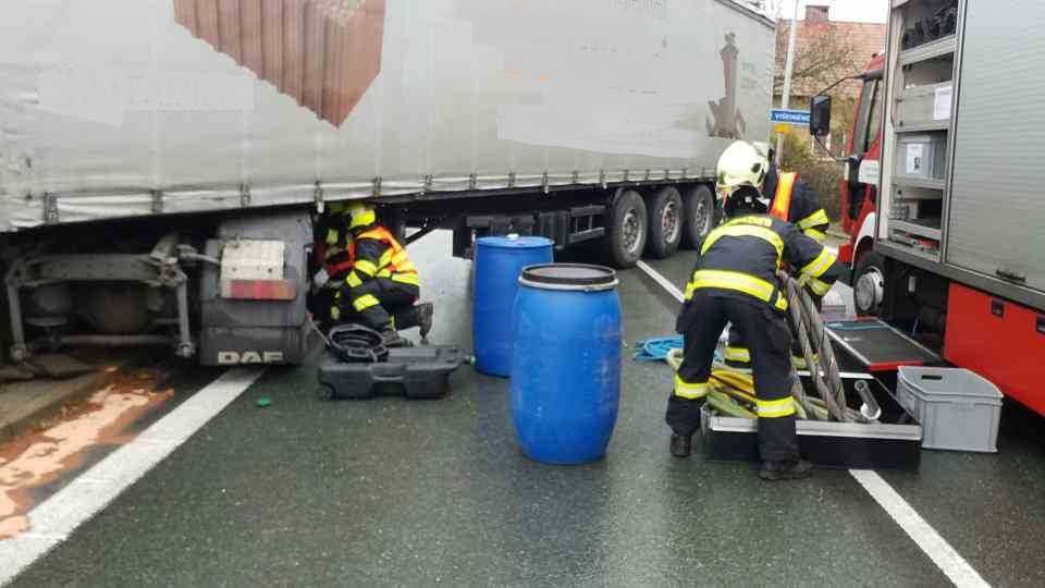 Z havarovaného kamionu hasiči museli přečerpat zhruba 300 litrů nafty