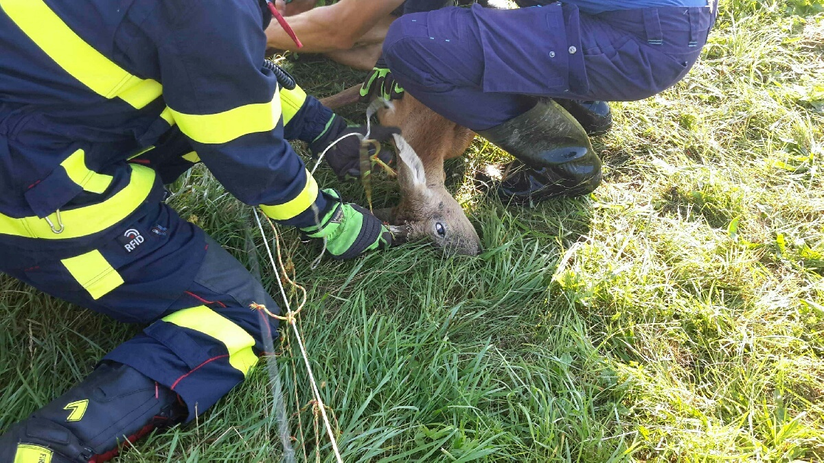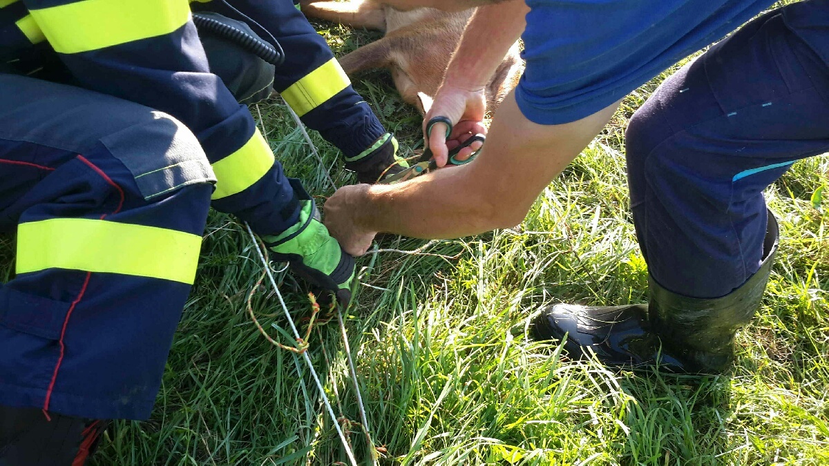 Srnci velmi často navštěvují zemědělskou krajinu a často je také uvidíme i na okrajích měst i ve vesnicích, a tak není divu, že byl nedaleko Bylan. Jenže tenhle srneček nemohl dál, zůstal totiž doslova uvězněn v lanku ohradníku. „Když jsme přijeli na místo srnec křičel, protože měl lanko zamotané nejen v parůžkách, ale jak sebou škubal, tak si zamotal do lanka i zadní nohu,“ přibližuje záchrannou akci velitel nprap. Michal Mrázek ze stanice Chrudim. Spolu s majitelem hasiči odstřihli lanko ohradníku a vysvobodili srnce, kterého hned vypustili do přírody. Poslední fotka dokazuje, jak rychle si to odpelášil a my věříme, že do bezpečí.