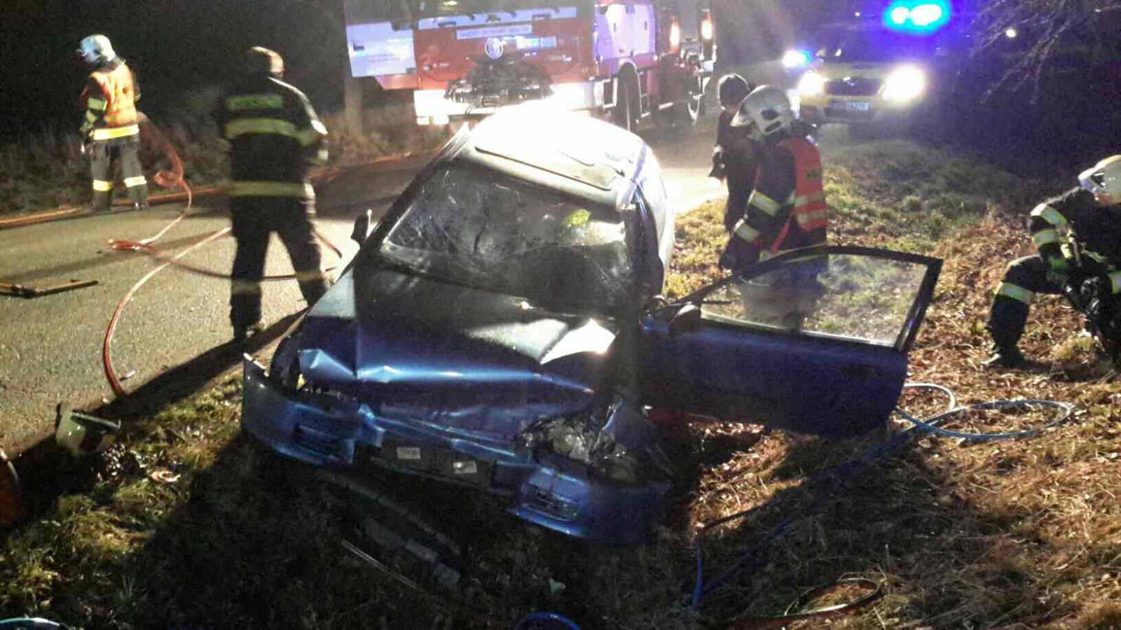 Řidič s osobním vozem narazil do mostku v příkopu. Uvnitř vozu zůstal zaklíněn řidič, kterého hasiči vyprostili pomocí hydraulického vyprošťovacího zařízení. Již při vyprošťování byl řidič v péči zdravotnické záchranné služby. Po odstranění následků nehody se hasiči vrátili na své stanice.