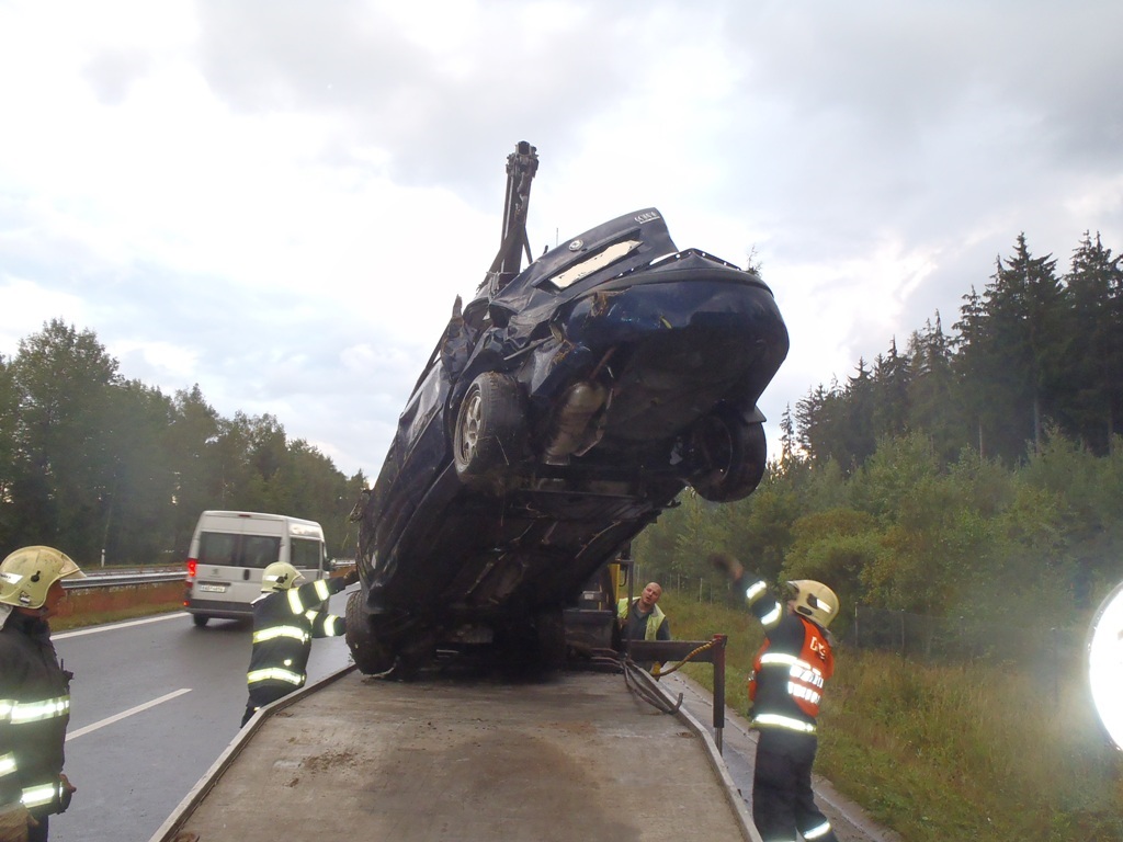 Hasiči pomohli naložit vozidlo na odtahovou službu a očistili silnici od střepů.
