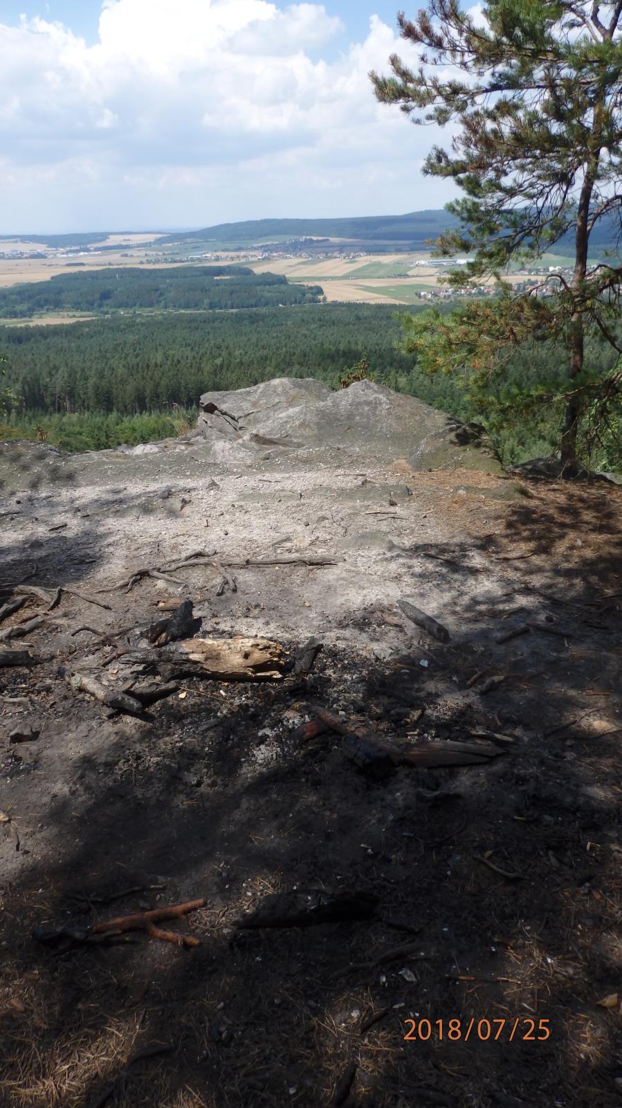 Skutečně dech beroucí krása. A právě proto Vás zarazí, že po celou Vaši cestu zalesněnou přírodní rezervací potkáváte velká, očividně stále používaná ohniště. Při červencové hodinové procházce jsme jich napočítali 5! Na všech byly zbytky ohořelých klád! U jednoho z nich je perfektně viditelný ohořelý kořen vzrostlé borovice. V centru přírodní rezervace! Uprostřed lesa! Vždyť každé malé dítě ví, že v lese se oheň rozdělávat nesmí! Že nebezpečí vzniku požáru je opravdu obrovské! Zvlášť v tomto ročním období s extrémním suchem. V mnoha krajích naší republiky je již Českým hydrometeorologickým ústavem vydána výstraha před nebezpečím vzniku požárů.