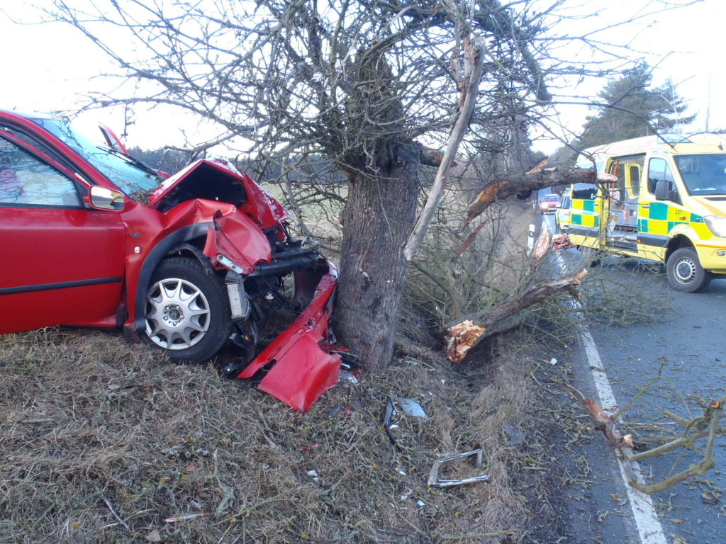 Hasiči musel rozřezat strom, který vozidlo svým nárazem zlomilo
