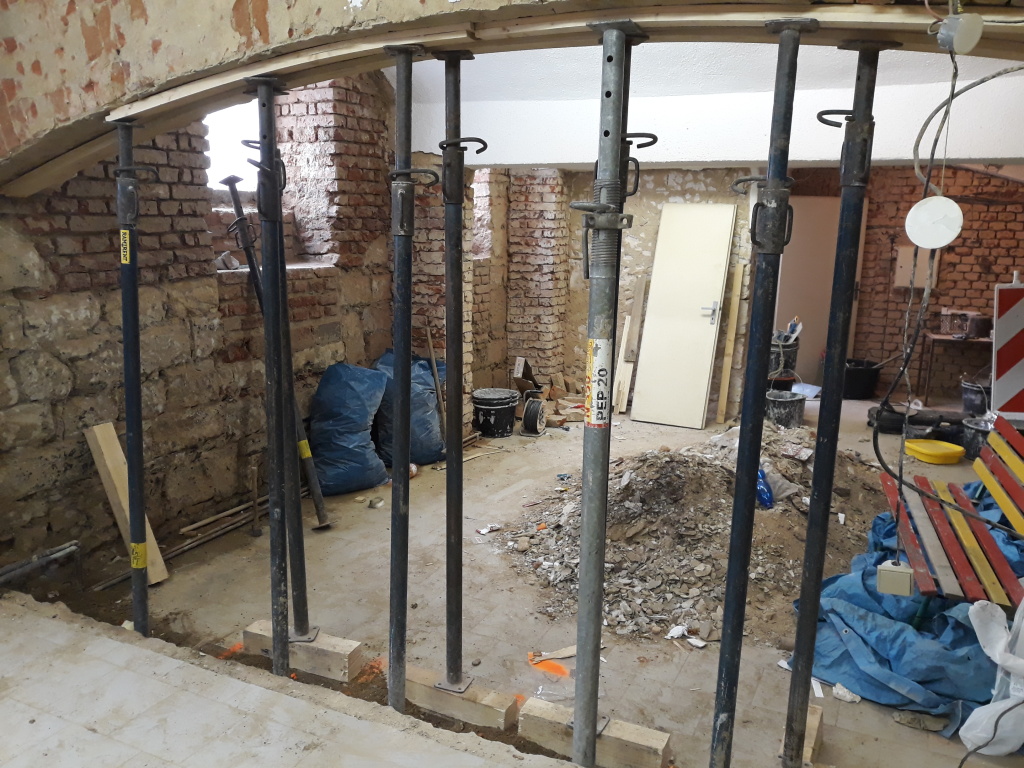 Na úrovni obvodové zdi probíhaly výkopové práce s cílem obnovení hydroizolace základů budovy. Uvnitř budovy se objevily v průběhu prací, které probíhají i uvnitř budovy, praskliny. Jednalo se o praskliny v klenbě a omítce kolem sklepních oken. Na místo události se dostavil statik, jenž rozhodl o stabilizaci budovy pomocí pažení. Hasiči tedy provedli zapažení výkopu výdřevou a podepření klenby ocelovými rozpěrnými tyčemi.