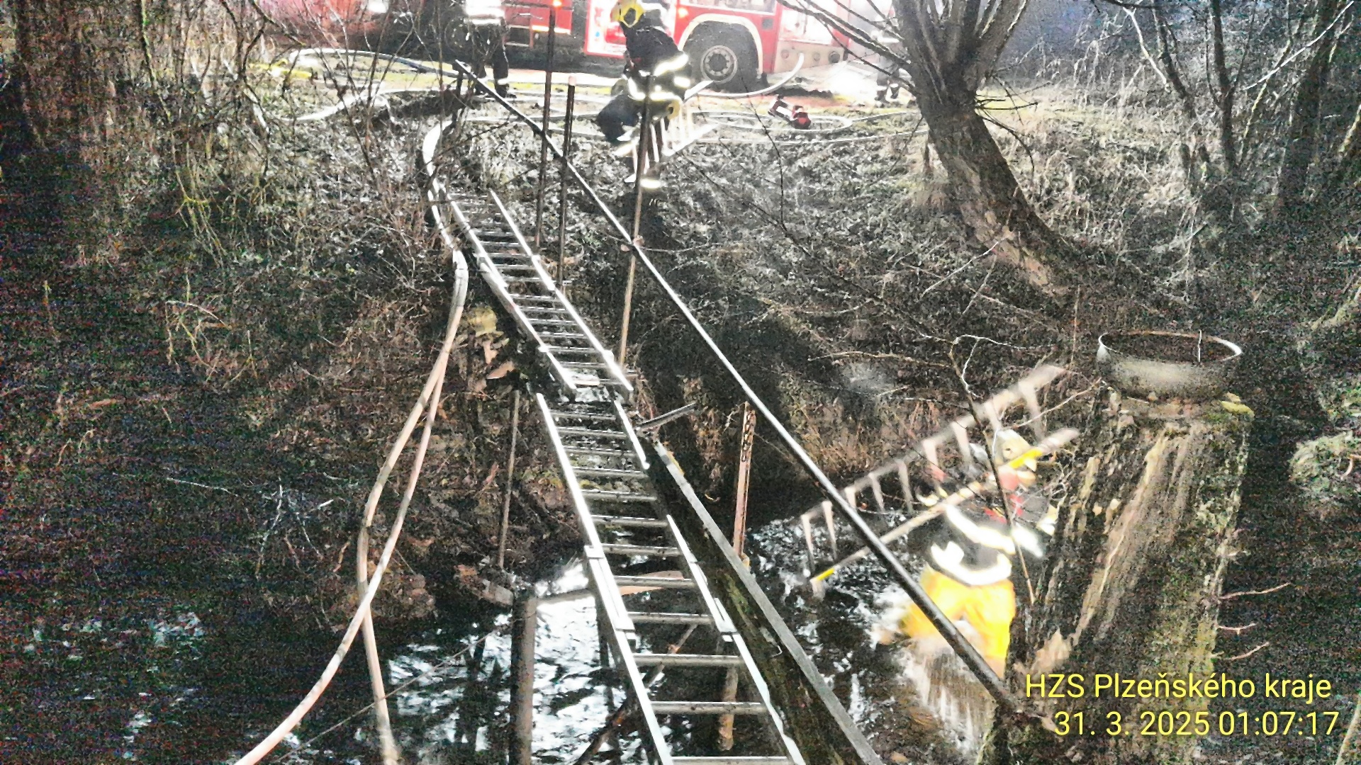 Z této konstrukce vytvořili provizorní přechod – pomocí nastavovacích žebříků položili pevný podklad a za použití jištění začali přenášet potřebné vybavení na druhý břeh. Adrenalin v krvi hasičů stoupal, čas hrál proti nim a oheň byl nelítostný.
